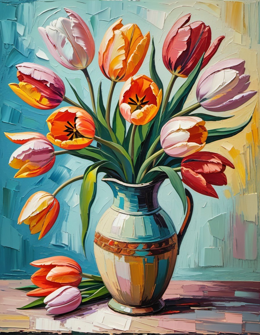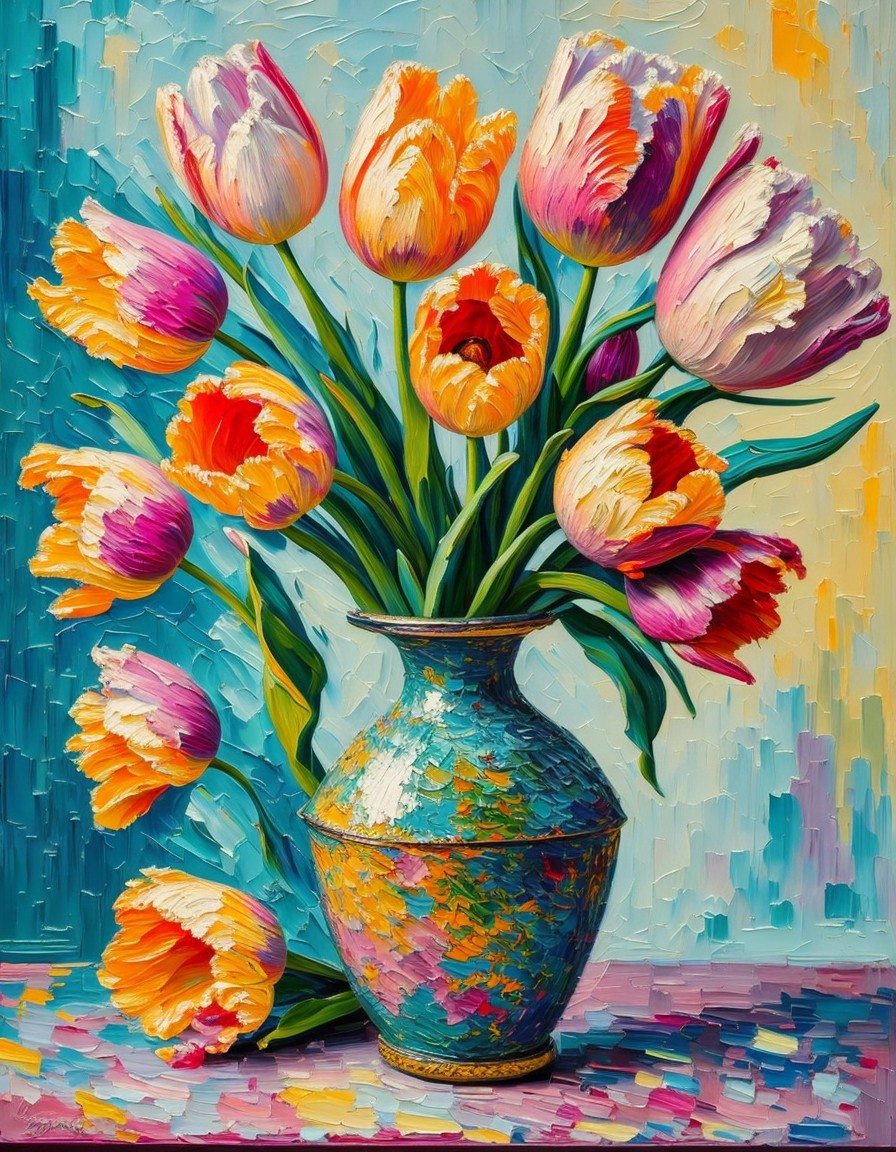 A vibrant oil painting of multicolored tulips in a mosaic-patterned vase against a textured blue background.