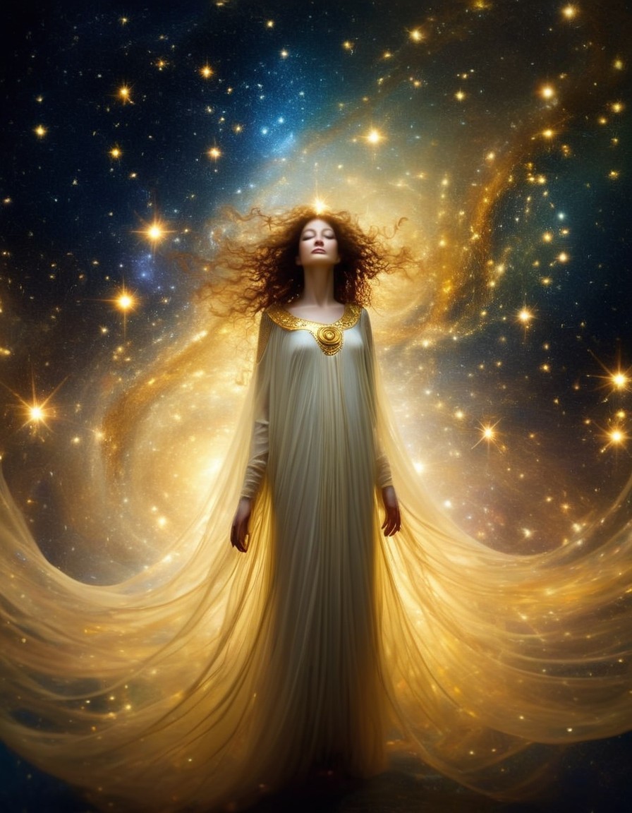 A woman with flowing red hair in a starry cosmos backdrop, wearing a golden gown with celestial motifs, evoking a dreamy, ethereal aura.
