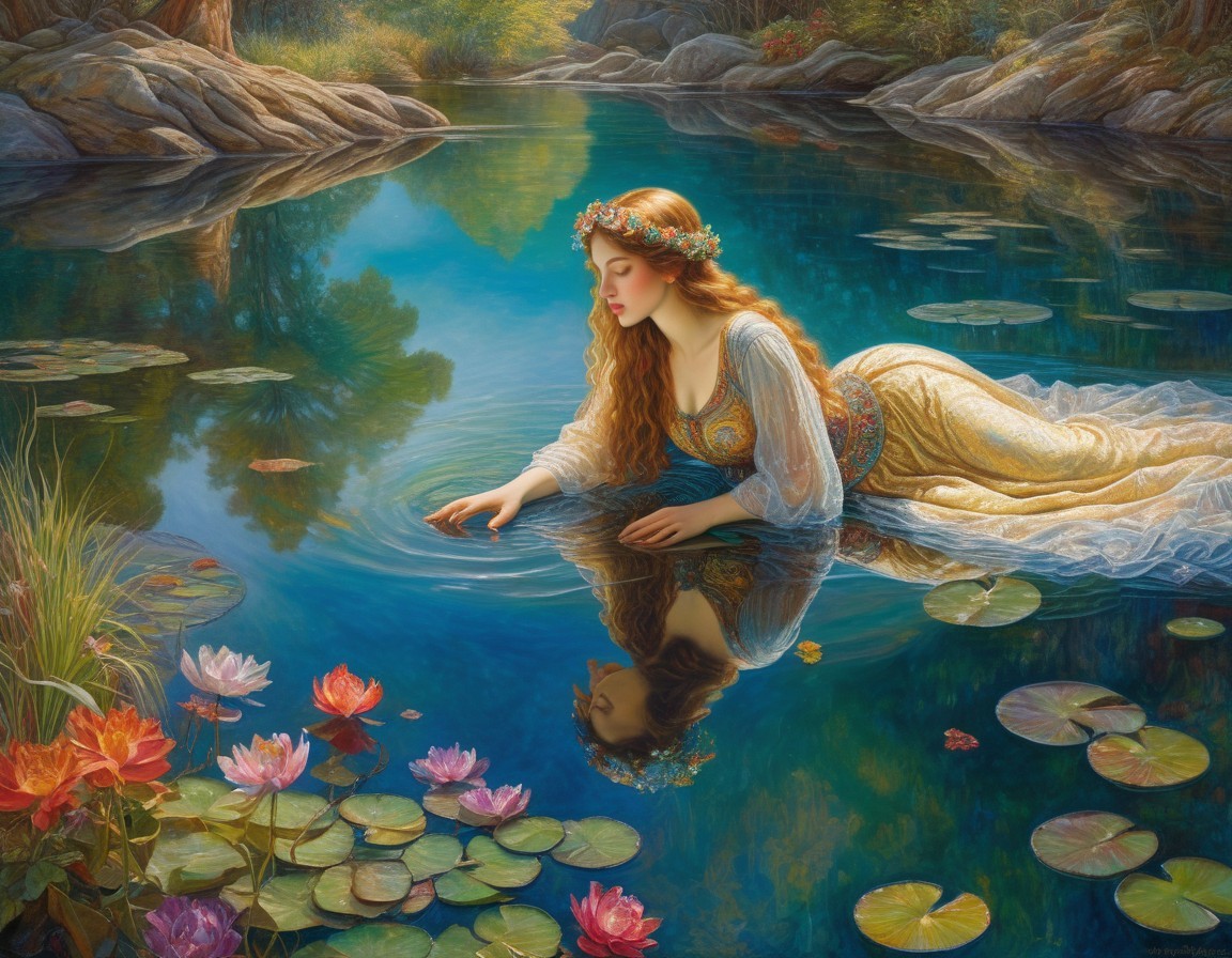 Prompt: A detailed and meticulous oil painting in the Pre-Raphaelite style, illustrating a maiden's reflection in a crystal clear lake, with shimmering natural lighting, full body shot, a direct overhead angle, featuring vivid and saturated colors, emotional depth, richness in detail, and detailed realism