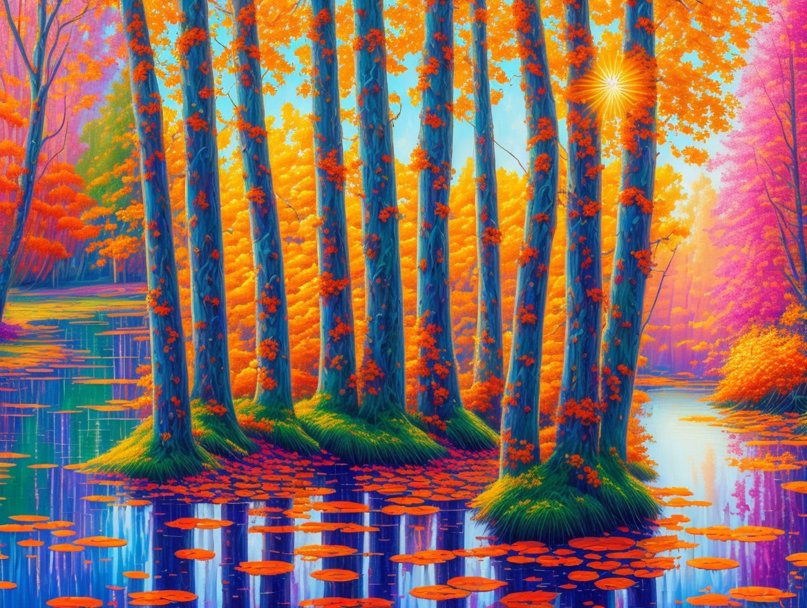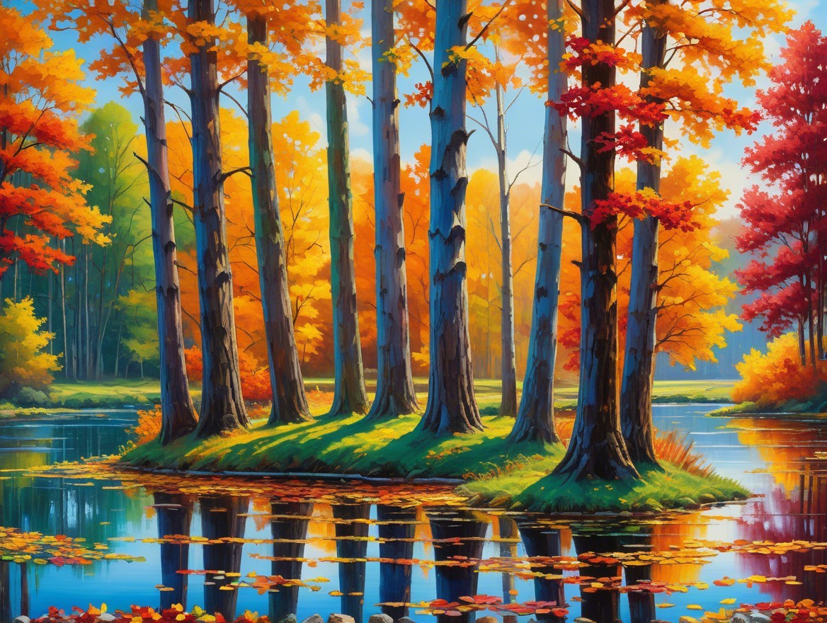 A serene autumn landscape featuring tall, vibrant trees with colorful leaves reflected in a peaceful lake. The scene captures the rich hues of fall amidst a bright blue sky.