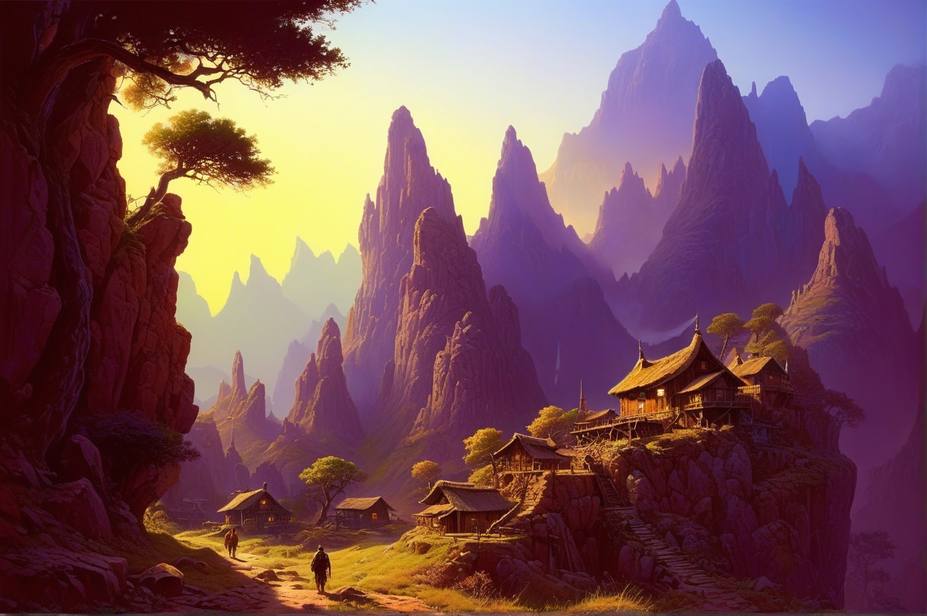 A serene landscape features quaint wooden houses nestled among towering mountains, bathed in warm sunset hues, with a lone figure walking along a winding path.