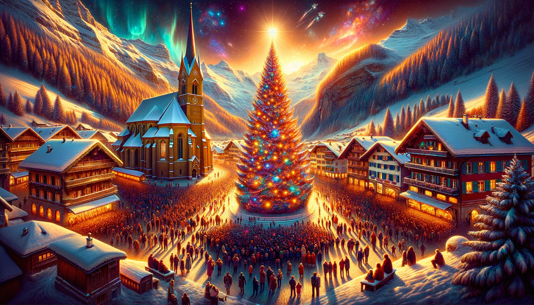 151515[a extrem high detailed painting of a christmas tree on the village square with many people in swiss village, shining church on the winter mountain ]{fantasy Scifi Art by Bruce Pennington and combinate with Paint Art by Robert Nesser}