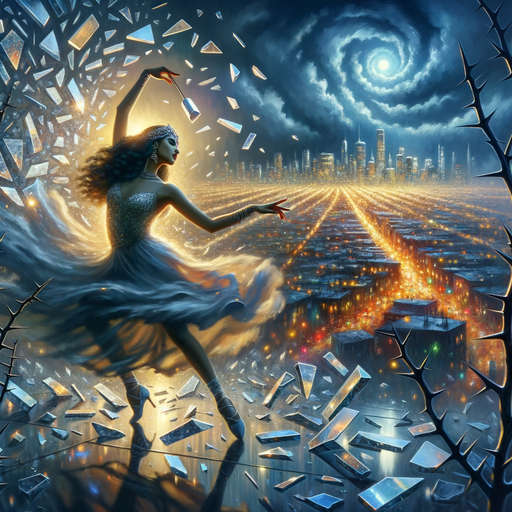 A silhouetted figure stands atop a rocky peak, gazing at a vibrant cosmic scene filled with swirling nebulae, bright stars, and colorful clouds, evoking a sense of wonder and exploration in space.