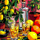 Prompt: lemons and grapefruits in glasses with ice cubes on the table, plants nearby, bottle of vodka on top, pink background, comic book style drawing in the style of hergé, flat colors, bold lines, vivid color palette, bright color scheme, bright lighting, sunny day.