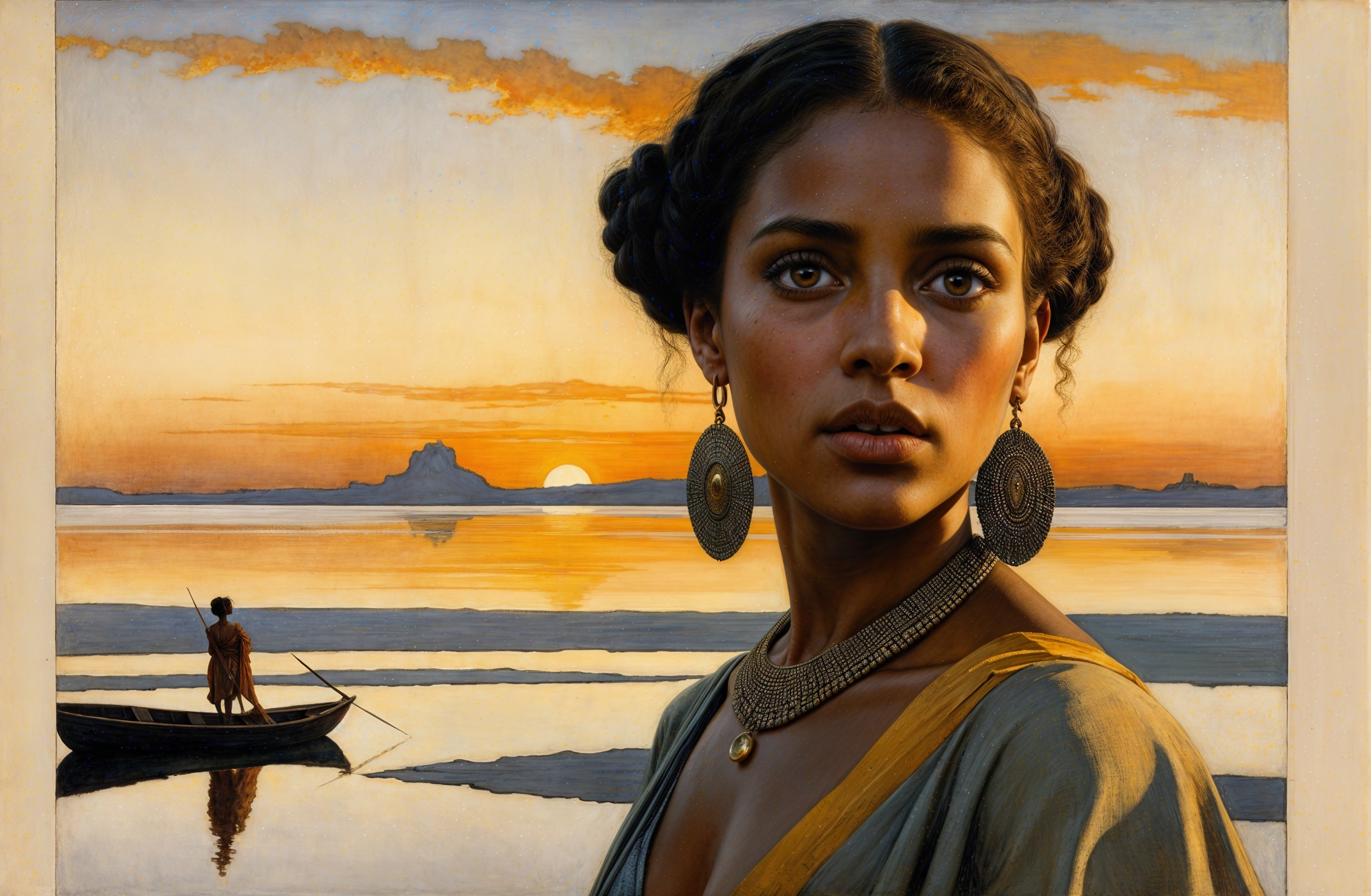 A striking portrait of a woman with dark hair and large earrings, set against a serene sunset reflected on water, with a lone figure in a boat on the horizon, evoking calm and beauty.