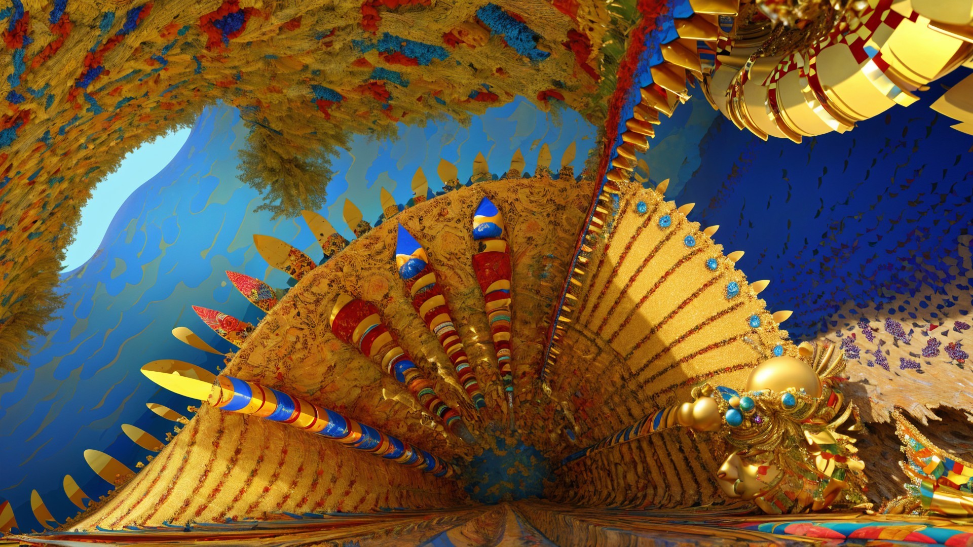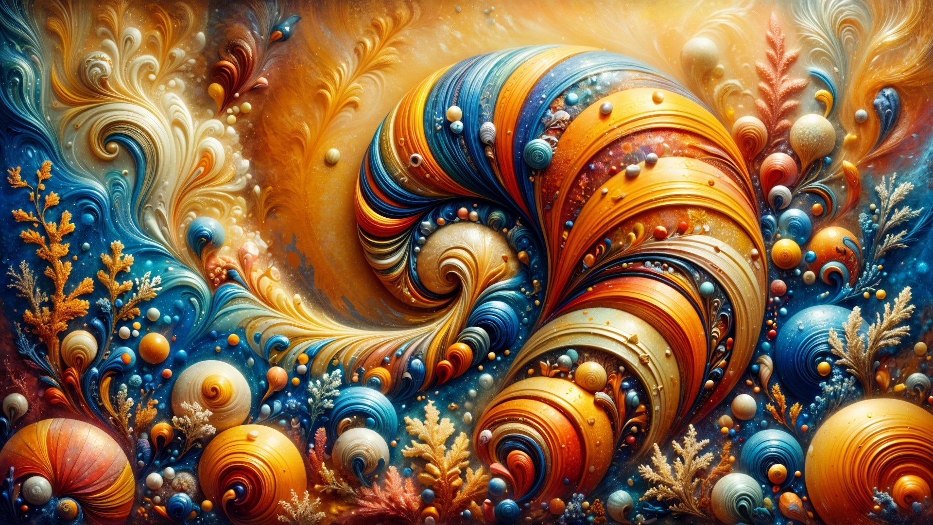 An intricately detailed underwater scene features swirling waves in shades of blue and turquoise, with a large, spiral seashell and golden coral amidst softly glowing orbs.