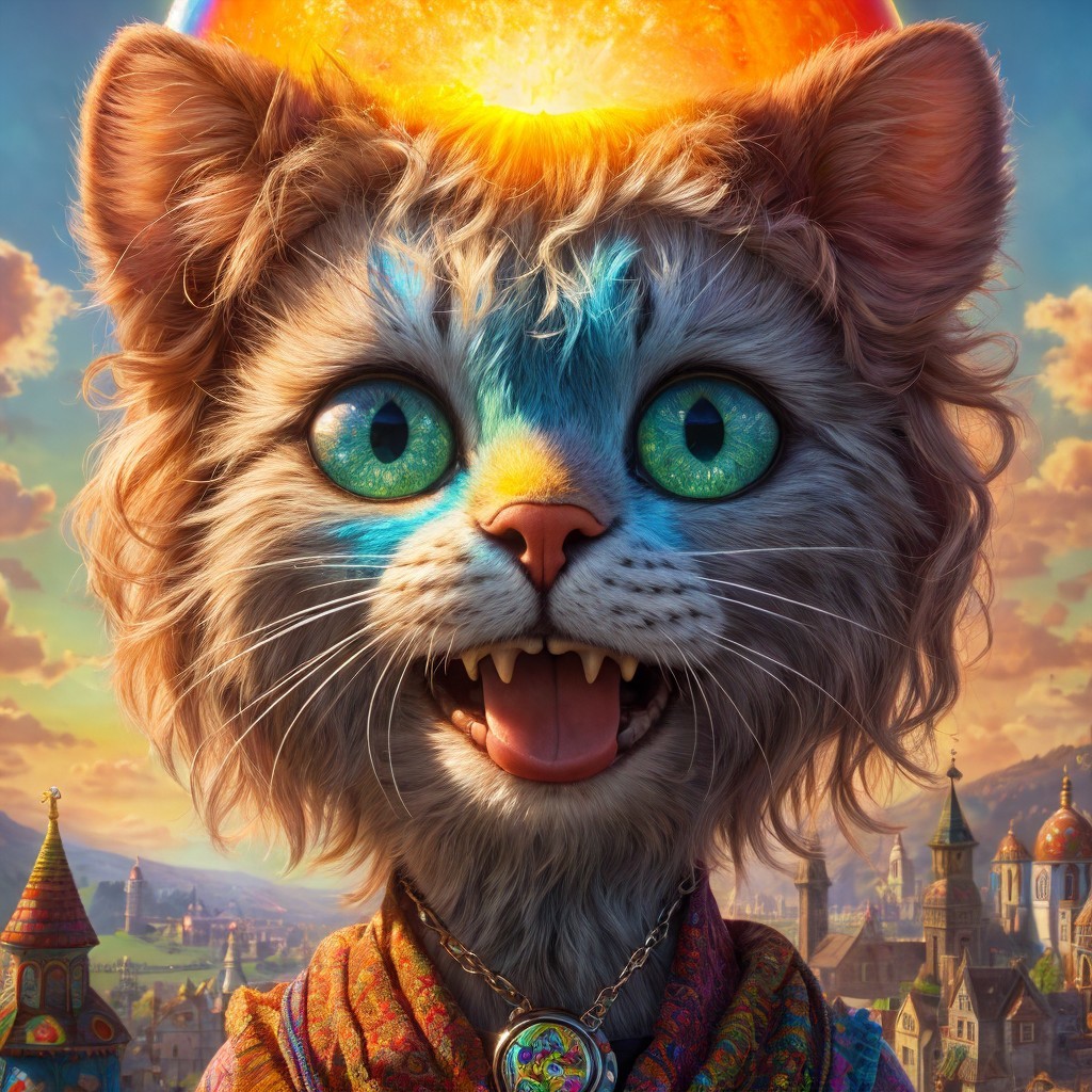 Whimsical Scene of a Joyful Fluffy Cat in Fantasy Landscape