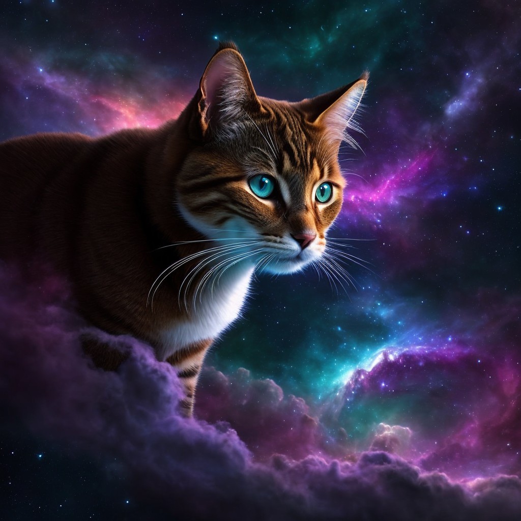 A majestic cat with striking eyes is superimposed on a vibrant cosmic backdrop of stars and nebulae, evoking a mystical and surreal atmosphere.