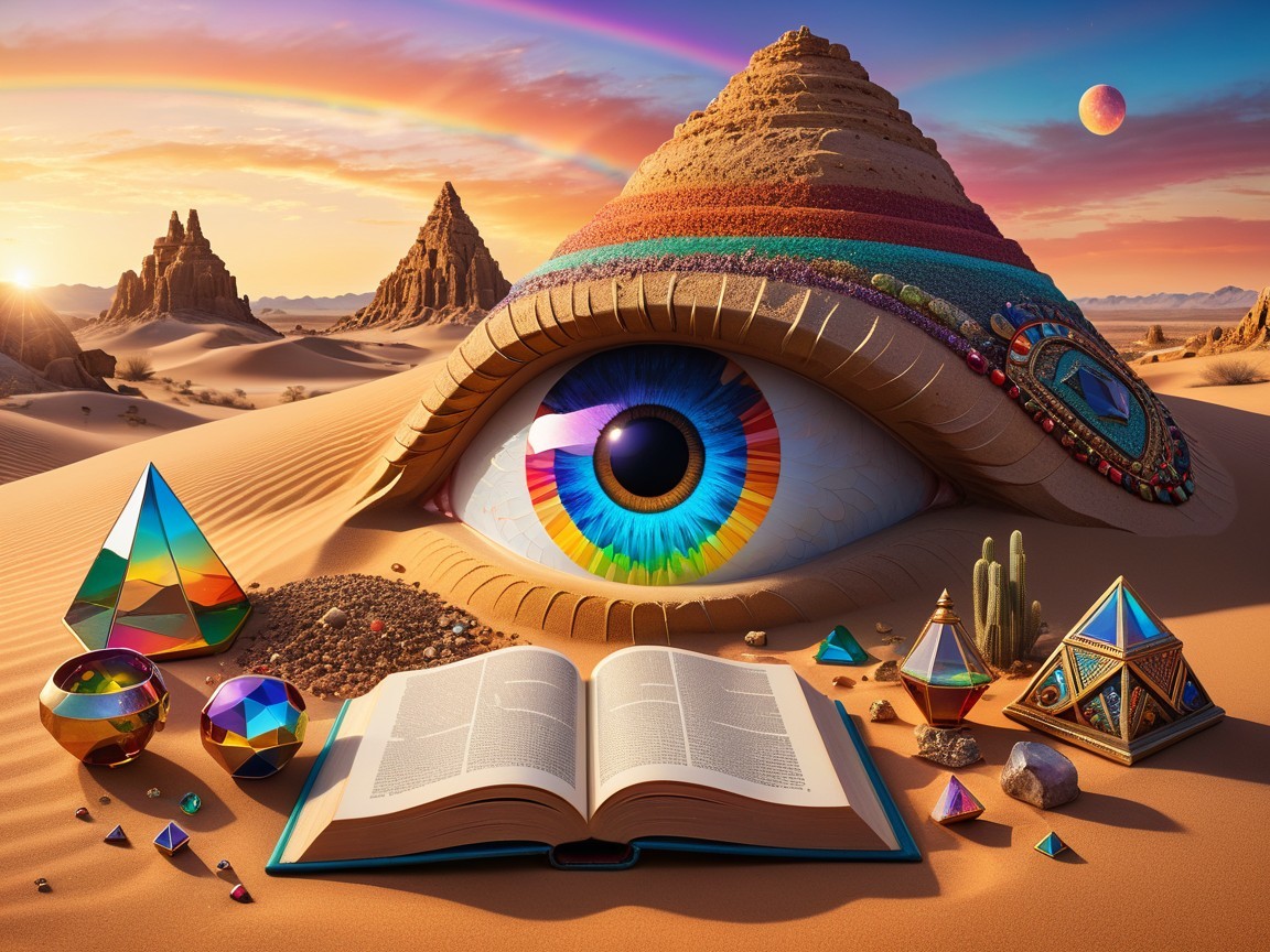 A surreal landscape features a giant, colorful eye made of sand, surrounded by pyramids and gemstones. An open book rests in front, set against a vibrant rainbow and distant planets.