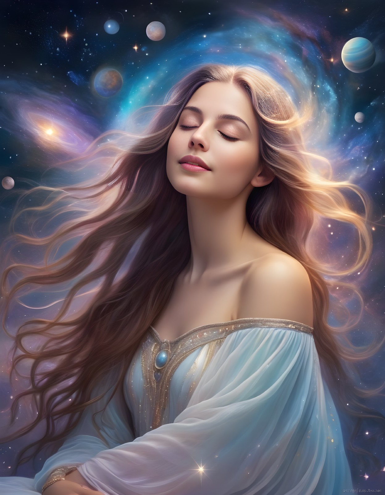 Prompt: "Celestial woman, ethereal beauty, serene expression, long flowing hair, eyes closed in bliss, hands cradling galaxies, stars, and planets, gentle smile, radiant aura, soft pastel colors, cosmic backdrop, nebulae and constellations, divine light illuminating her, surreal and dreamlike atmosphere, digital painting, intricate details, glowing and shimmering elements, by Olivia De Berardinis and Alex Grey, Artstation."