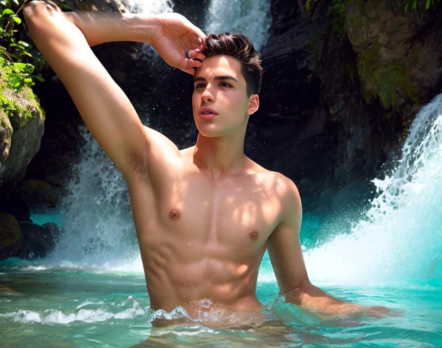 Seb is baked swimming under a waterfall. He pauses to catch his breath