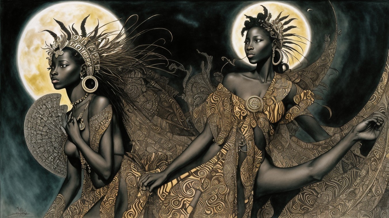 The image features two elegantly adorned women with intricate jewelry and braided hairstyles, set against a night sky with two glowing moons, embodying strength and beauty.