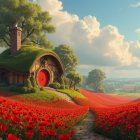 A whimsical landscape featuring a large mushroom-shaped house amidst vibrant red foliage. Smaller mushrooms dot the scene, while two figures sit nearby, enjoying the enchanting atmosphere under soft clouds.