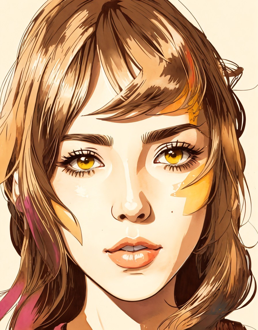 Woodblock print, stylized lineage makes Female face, line-art, anime style, tints of graffiti art, high coloring, brightness 1.3, triadic color scheme beige brown yellow, stylized watercolor and ink illustration, headshot, hues, traumacore, soft rounded edges, delicate coloring, limited pallet,cottagegore 1.2, soft rounded edges, fine strokes, encoustic orange streaks, octane render, Geometrical portrait with tints of graffiti art in style of Georgia O'Keeffe, brightness 1.4, high coloring 1.3, geometrical illustrative style, Pastel colors of ochre auburn orange, crisp quality, vector 9:5, intricate stylized hairstyle, zentangle method, watery paint, grunge,strict essence, acid spill, american gothic 1.9, dynamic lighting 1.8 3d effects 1.8, ambient occlusion 1.2, anisotropic filtering 1.7, ethereal scenery, background in triadic color scheme pink auburn beige, muted colors, plasticity 1.9, stylized lineage illustration, geometrical features, natural, detailed background, dynamic lighting from top to centre, stylized illustration 1.9, beautiful composition 1.9, gorgeous, sober, dense, gorgeous zentangle illustration 1.8, embossed strokes,