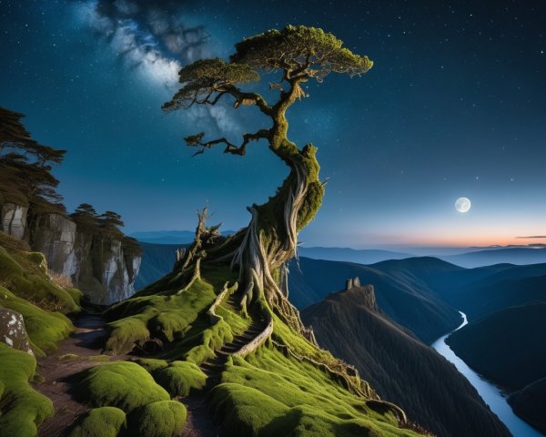 A serene landscape depicts a tranquil river with lily pads, framed by lush greenery and a charming wooden bridge. The soft blue tones and a radiant sun create a peaceful atmosphere.