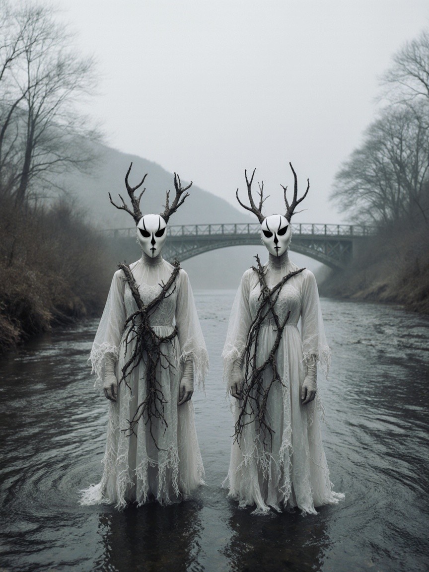 Two eerily beautiful figures stand in a misty river, wearing white gowns and masks. They are adorned with antlers and vines, creating a hauntingly ethereal atmosphere under a bridge in the background.