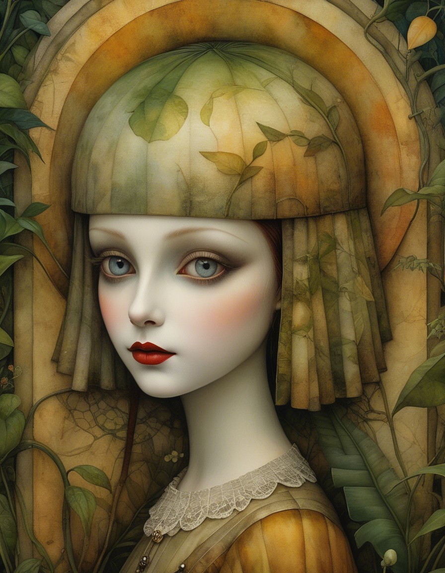 Close up, impish devious beautiful Pierrot creature in a garden jungle maze, in the style of Alexander Jansson. by Catrin Welz-Stein, Michael Parkes