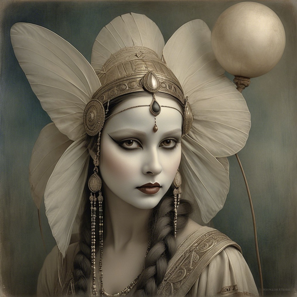 A striking portrait of a woman with elaborate makeup and a regal headdress featuring large white feathers. She exudes a blend of elegance and mystique, set against a muted backdrop.