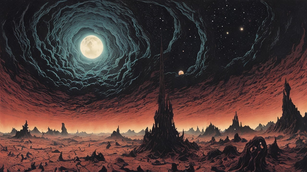 Prompt: "The pit of eternal despair and tentacles, starry wisdom on Mars. Lurid technicolour.