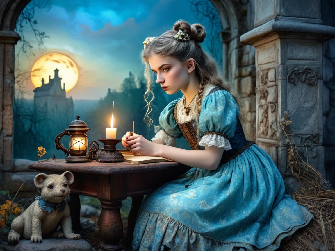 invisible, faint translucent image, washed-out, pale specter, faint impression, muted watercolor, faded, bare pattine silhouette, acid etched, walking, reduced to the floorThumbelina, a tiny human child, looks like an ordinary miniature girl in a simple dress, barefoot, holding a sewing needle. She is thumb-sized and perches on a floating green leaf in a pond. Above her, a giant dragonfly with large, shimmering, translucent rainbow wings approaches to rescue her. Around the leaf, angry toads splash in the water among the reeds and willow roots, while red poppies bloom on the shore. Golden sunlight over the meadow, cinematic fairy-tale realism, intricate natural details. In the style of Kay Nielsen × Brian Froud × Kinuko Y. Craft A beautiful gothic anime-style girl lying on her back on the beach in full body view. She is resting on the soft golden sand, her body relaxed yet elegant, with her legs spread apart naturally to each side, creating a graceful posture. She is wearing a minimalistic white bikini with a thong-style bottom, paired with pure white thigh-high stockings that stand out brightly against her smooth, pale skin. Her toned legs and feminine curves are emphasized by the sunlight, with soft highlights and realistic textures. The white stockings are detailed with delicate fabric shine, making them look almost silky. Her torso is slightly arched, emphasizing the curve of her waist, chest, and hips. She has turned her upper body slightly toward the camera, making her face visible. Her gothic-inspired face is striking: pale porcelain skin, big expressive eyes with dramatic eyeliner, subtle green glow in her irises, eyes rolled upward, and her tongue playfully sticking out, adding a sense of heat and exhaustion. Her cheeks have a subtle flushed blush, and a slight sheen of sweat on her forehead and upper lip enhances the hot, summery atmosphere. Bold black lipstick enhances her gothic aesthetic. She wears a thin black choker necklace with a silver cross, adding gothic elegance to her beach look. Her short stylish hair, dyed pastel pink with dark undertones, spreads softly across the sand, moving slightly with the breeze. The background is cinematic and dreamy: the ocean stretches out behind her, with a majestic sailing ship floating in the distance. Above, the sky is vast and radiant, filled with fluffy clouds and brilliant shades of blue. The sunlight creates a luminous, soft glow across her body, enhancing the natural anatomy and giving a surreal, romantic mood. Camera perspective: angled from above and slightly from behind her legs, showing her full figure, the elegant line of her body, her face turned toward the viewer, and the harmony between her pose and the ocean scenery. Ultra-detailed, highly realistic yet with anime aesthetics, cinematic illustration, 8K ultra quality, perfect anatomy, flawless skin, gothic beach fantasy atmosphere, emphasizing heat, exhaustion, and playful seductiveness. Heavily textured. Arthur Rackham, John Holland, Maxfield Parrish, sunset afterglow, scratching, layered, beautiful moody colors, magical atmosphere, cinematic lighting. Dramatic and surreal. Modifiers: fantastic view high definition hdr cinematic postprocessing Magical realism mystical Frank Frazetta luminism Brian Froud 3D shading alcohol ink Batik beautiful colours Hyper-textured