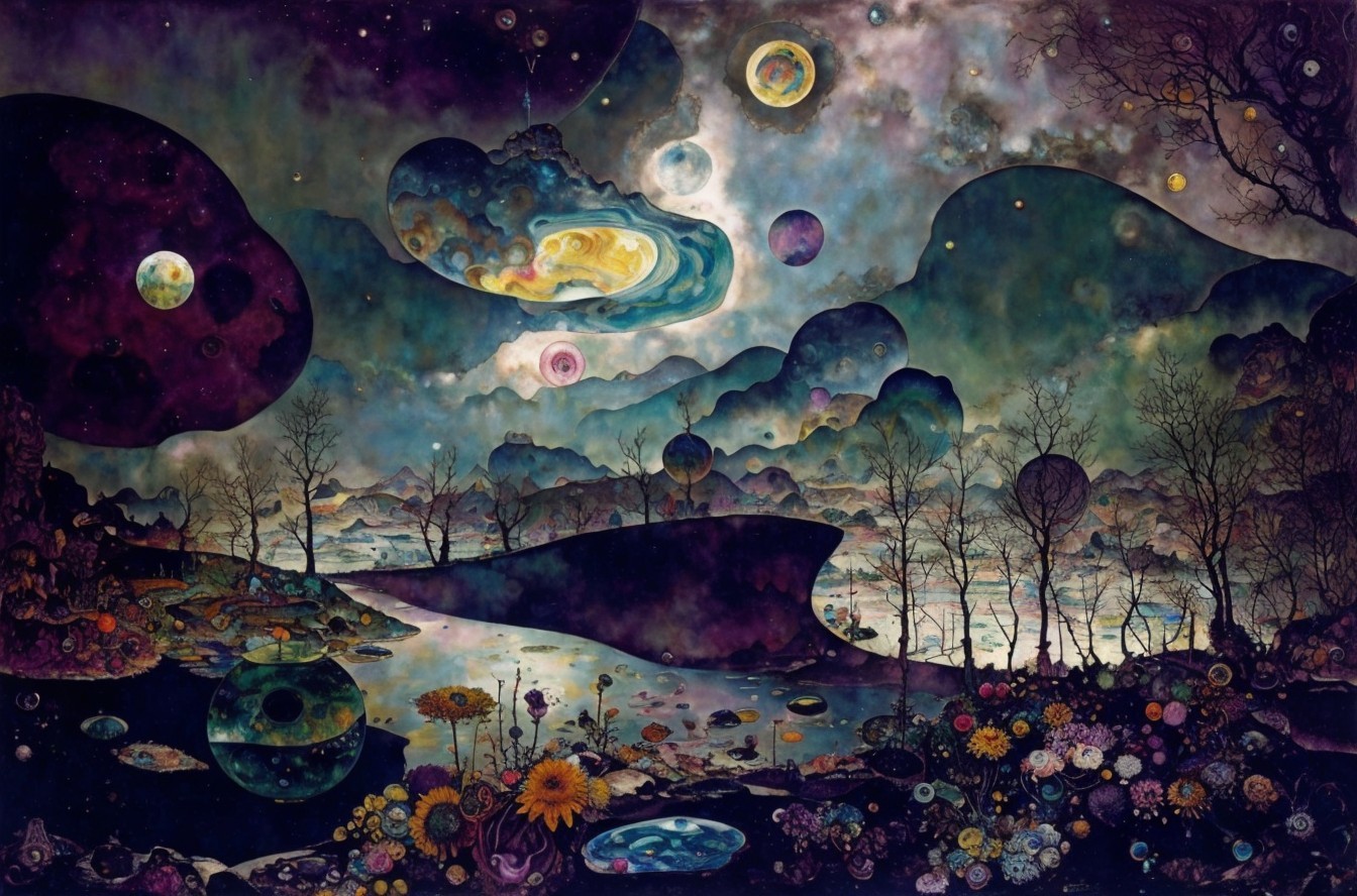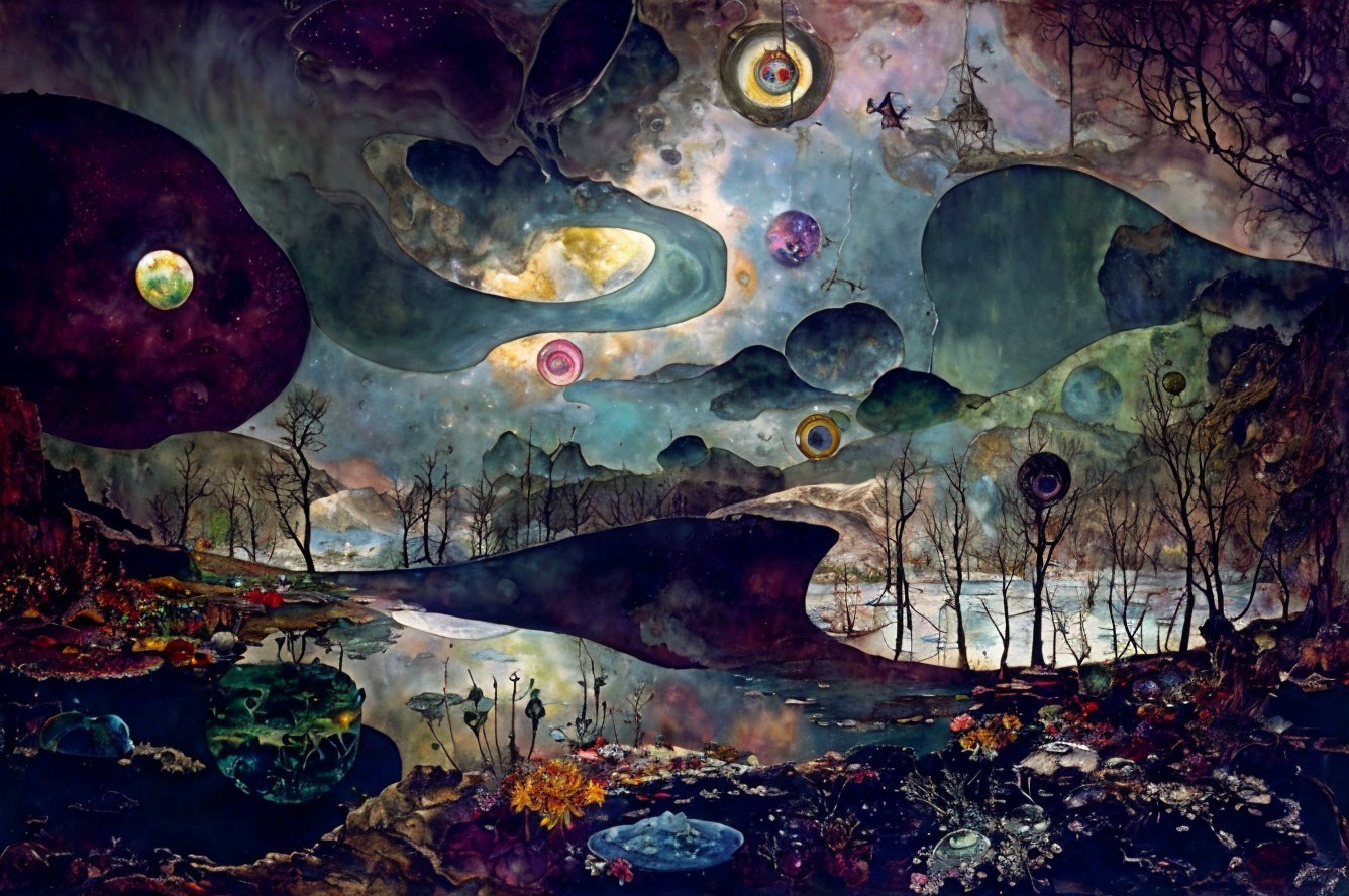 + Prompt:an alien landscape of weirdness and magic, partly frozen lake, landscape of acryllic pour, flowers and metal rods cosmic, glowing mirror orb, smiling full moon in sky, by Egon Schiele, David Lynch. mixed media, some absurd details