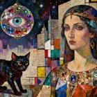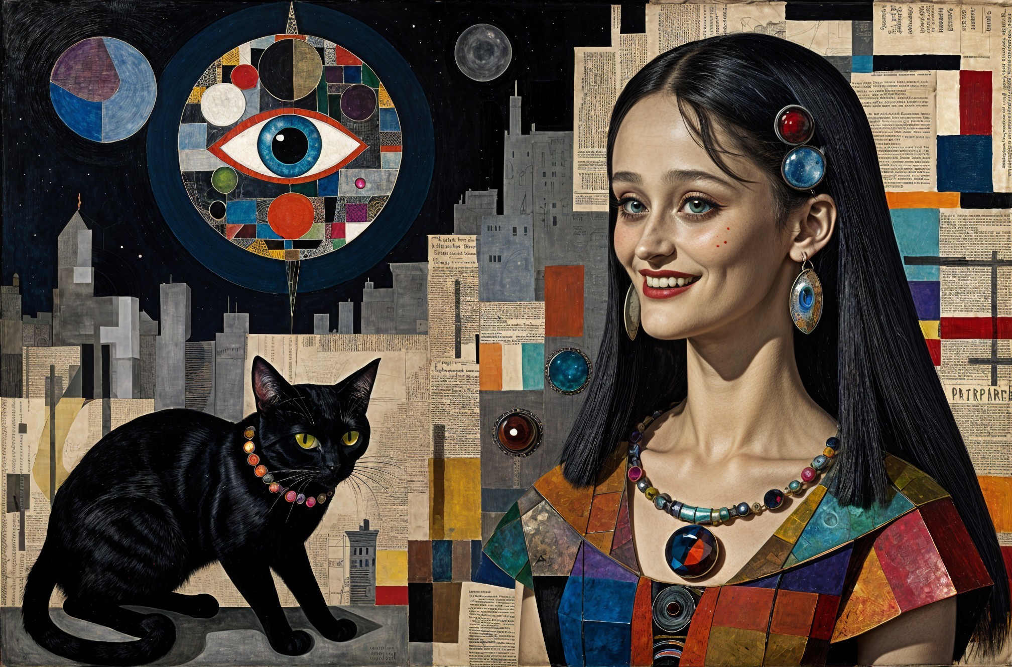 A collage image in the style of constructivism, with a woman and a black cat on a background consisting of a cityscape at night with a full celestial body above, and textured abstract shapes. The woman is on the right side of the image, facing right but looking at the viewer. She is fair