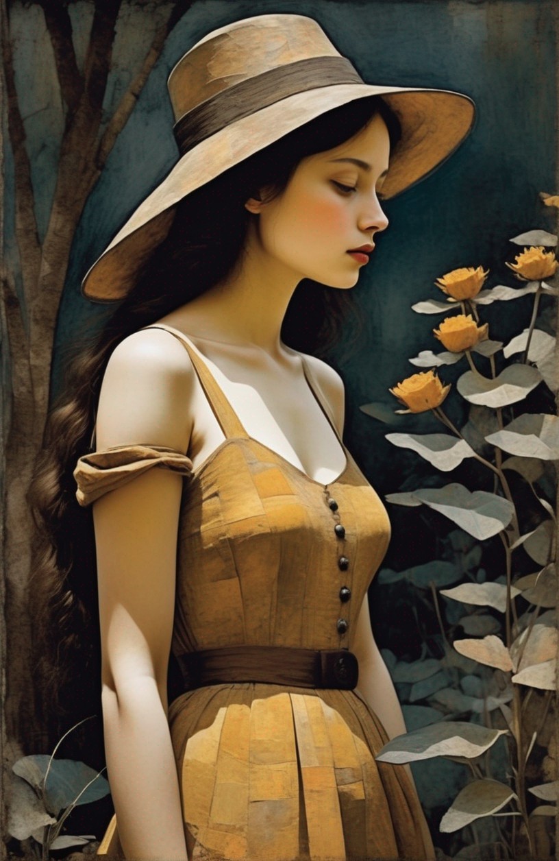 Woman in Wide-Brimmed Hat and Sleeveless Dress Among Autumn Leaves