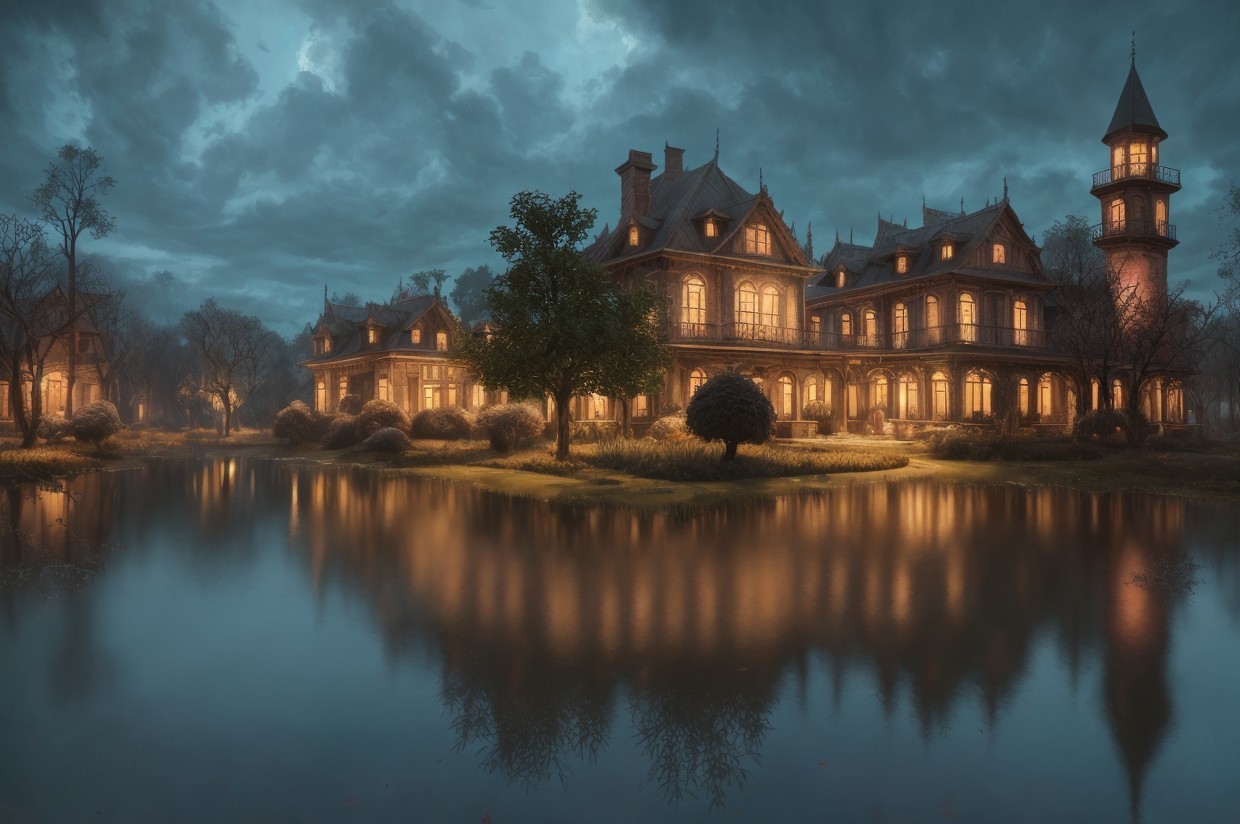Haunted house, trees in the distance, tree leaves on the ground, mischievous and gorgeous.