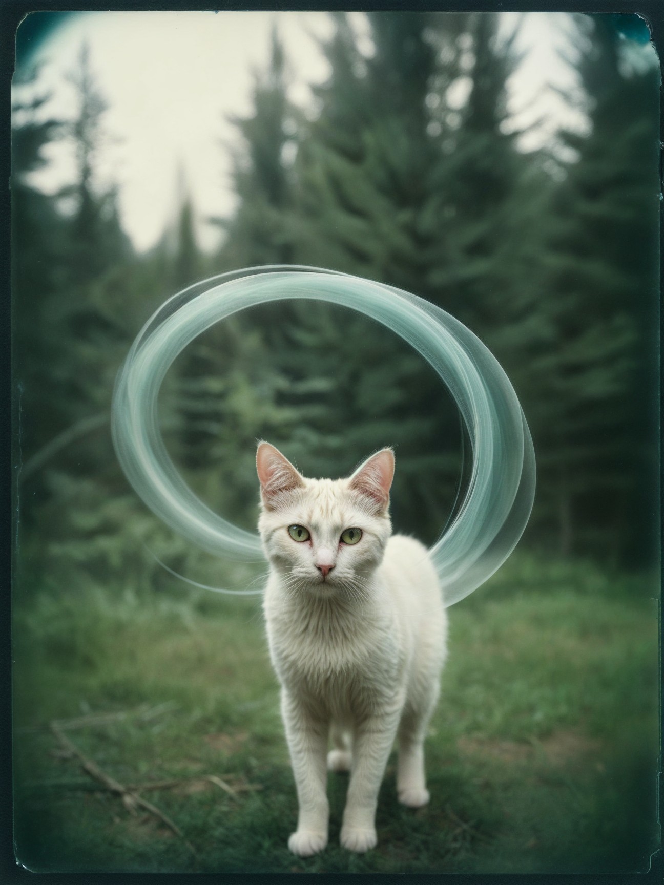 (Try from marek zarnovicky) - A curious white cat stands in a lush green forest, surrounded by tall trees. A soft, swirling mist encircles its body, adding an ethereal quality to the enchanting scene.