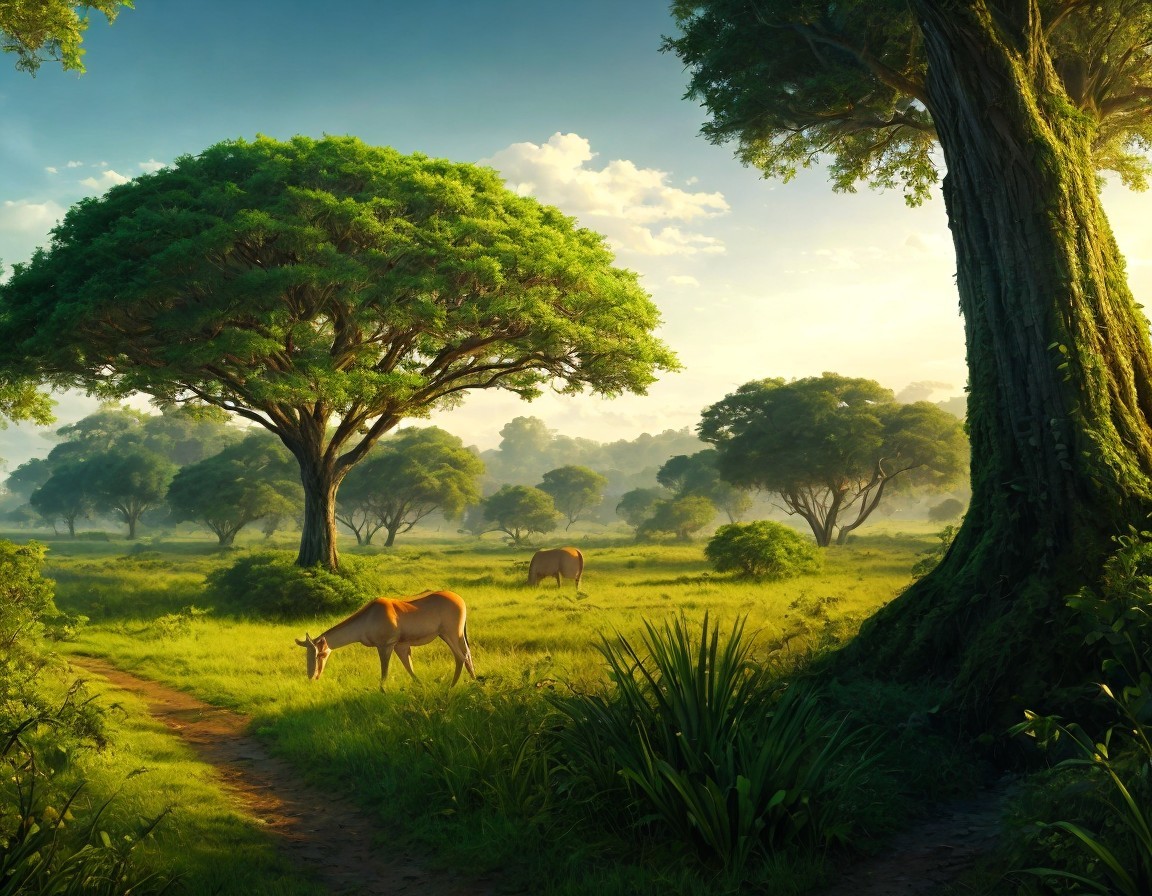Serene Savanna Landscape at Sunrise with Silhouettes