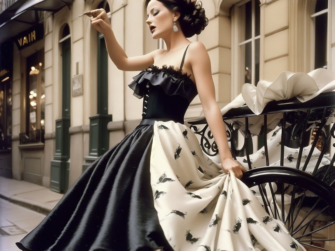 A woman in a striking black and white gown stands elegantly in an ornate urban setting. Her dramatic hairstyle and accessories complete her glamorous, vintage-inspired look.