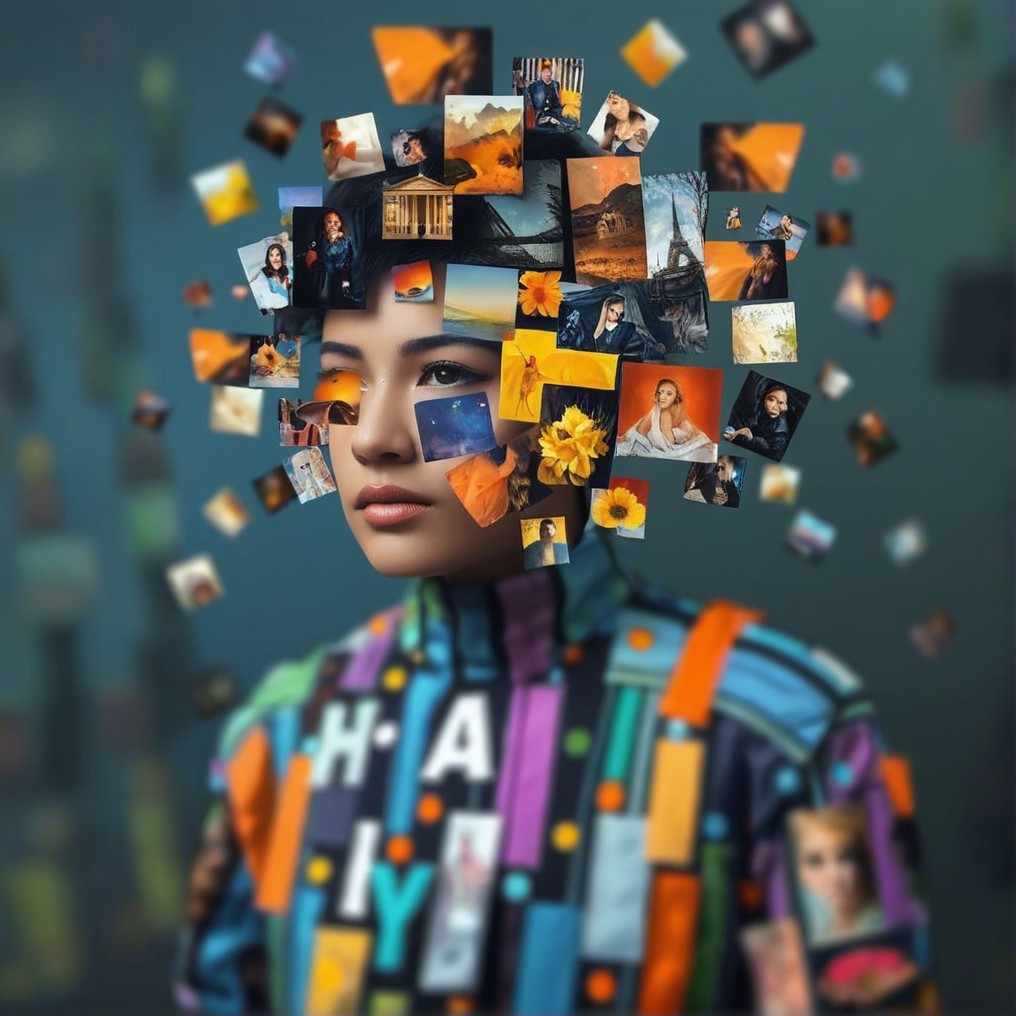 A person with a vibrant, multicolored outfit stands against a muted background, while an array of images floats around their head, symbolizing creativity and diverse ideas.