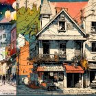 A vibrant urban scene featuring a charming house amidst colorful murals, cafés, and people strolling by. A classic car adds a nostalgic touch, enhancing the lively atmosphere.