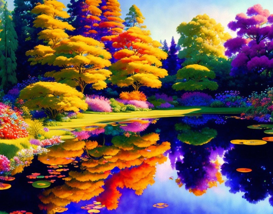 Prompt: Wide view, 3D watercolor patchwork of a pond reflecting a beautiful garden with numerous flowers in multiple vibrant saturated colors, slender trees, delicate plants, lacy ferns, golden sunrise rays shimmering over the scene, intricate, satiny, high quality, elegant, highly detailed, glistening magic style, by Maxfield Parrish, with elements in the style of Jan Toorop