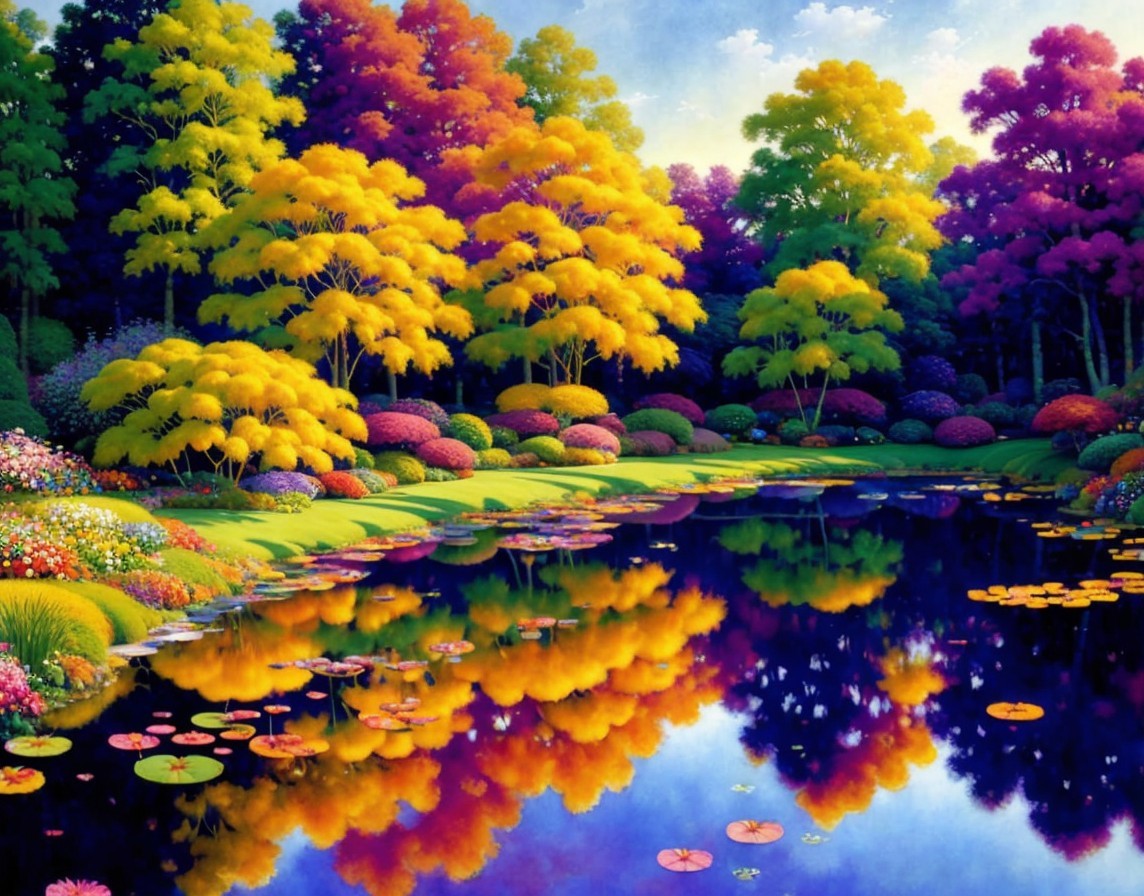 Wide view, 3D watercolor patchwork of a pond reflecting a beautiful garden with numerous flowers in multiple vibrant saturated colors, slender trees, delicate plants, lacy ferns, golden sunrise rays shimmering over the scene, intricate, satiny, high quality, elegant, highly detailed, glistening magic style, by Maxfield Parrish, with elements in the style of Jan Toorop