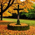 A surreal landscape features a glowing, circular structure on a vibrant, textured ground. Dark trees silhouette against a swirling, colorful background of orange and green hues at sunset.