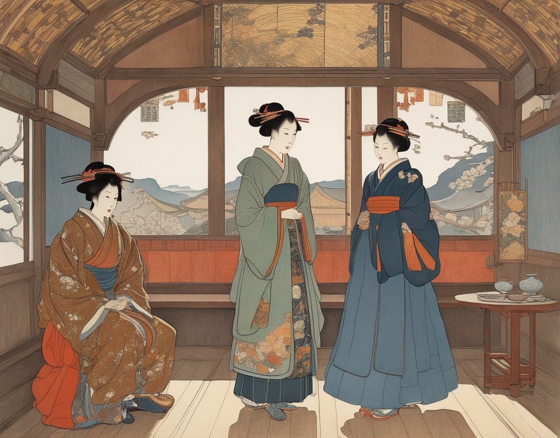 An artistic illustration of a woman in traditional Asian attire, seated by a table with a teapot, holding a brush.