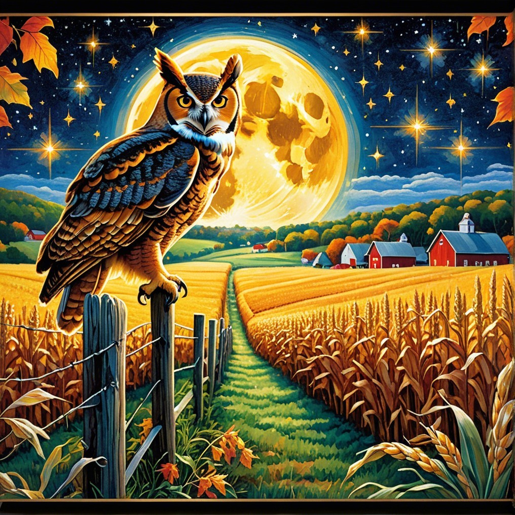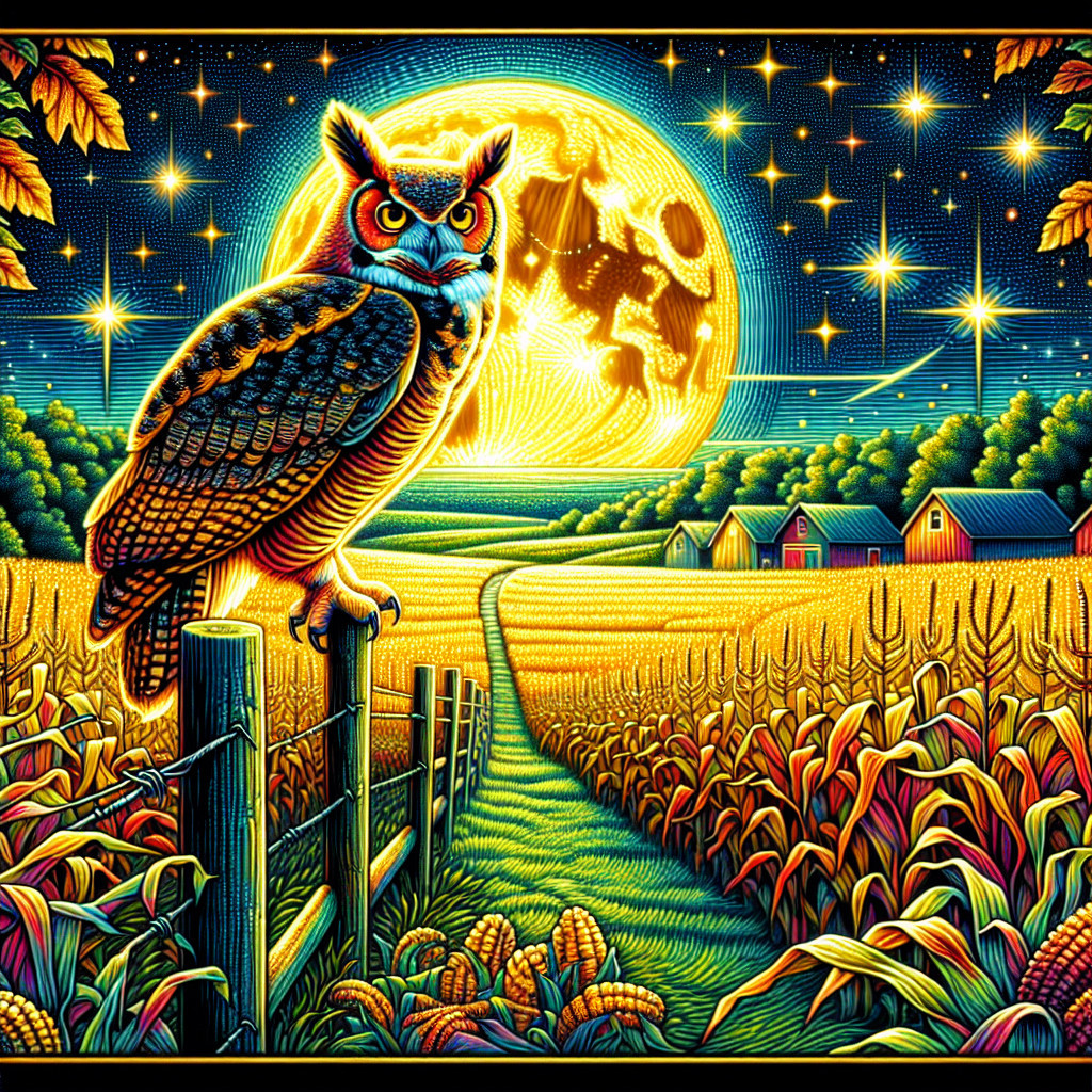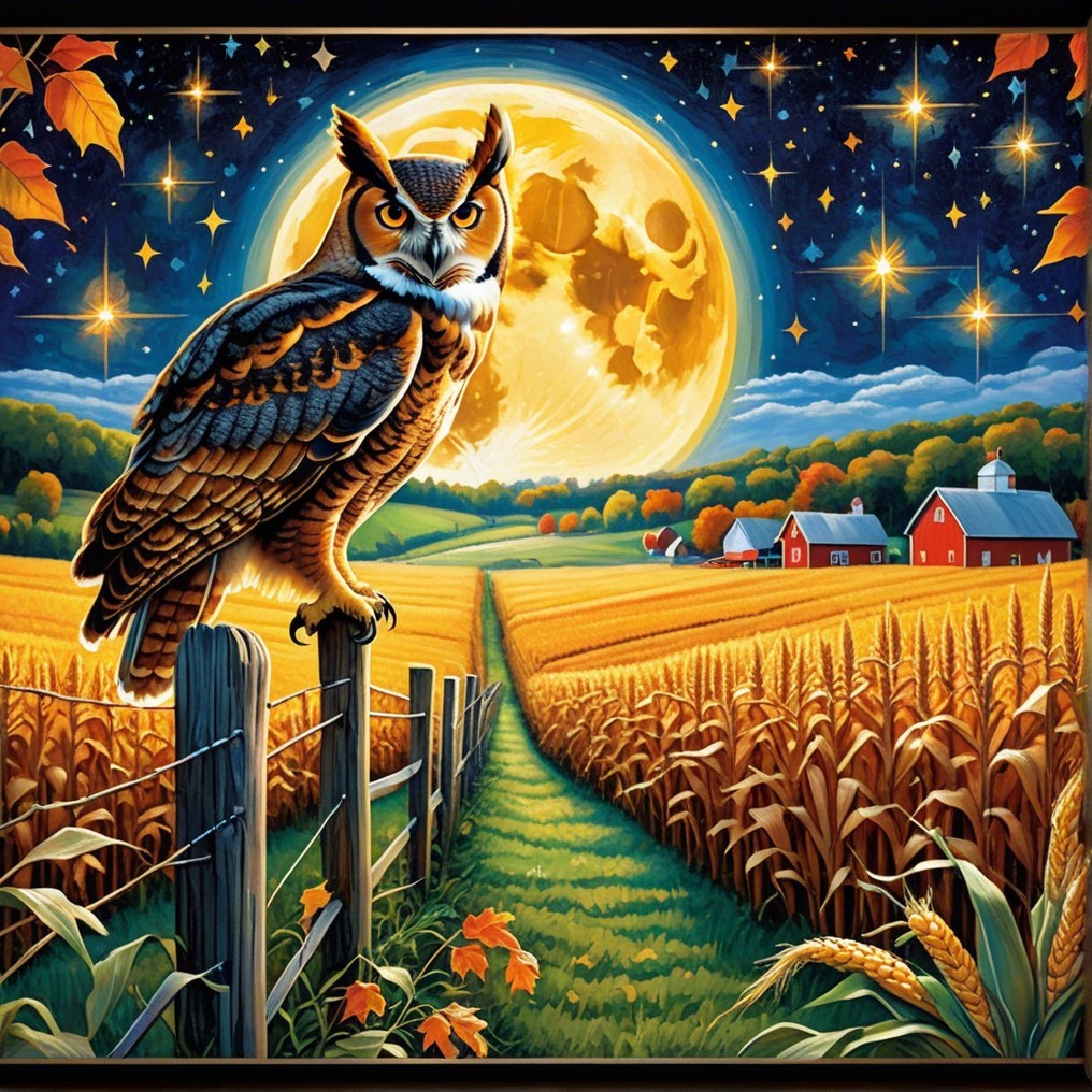 A majestic owl perches on a fence post in a golden cornfield, illuminated by a bright full moon. The night sky sparkles with stars, while red barns dot the serene countryside landscape.