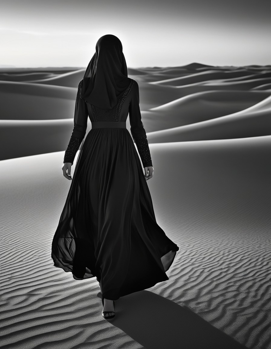 A person in a black dress with intricate designs stands amidst sweeping desert dunes, casting a long shadow under a dramatic sky.
