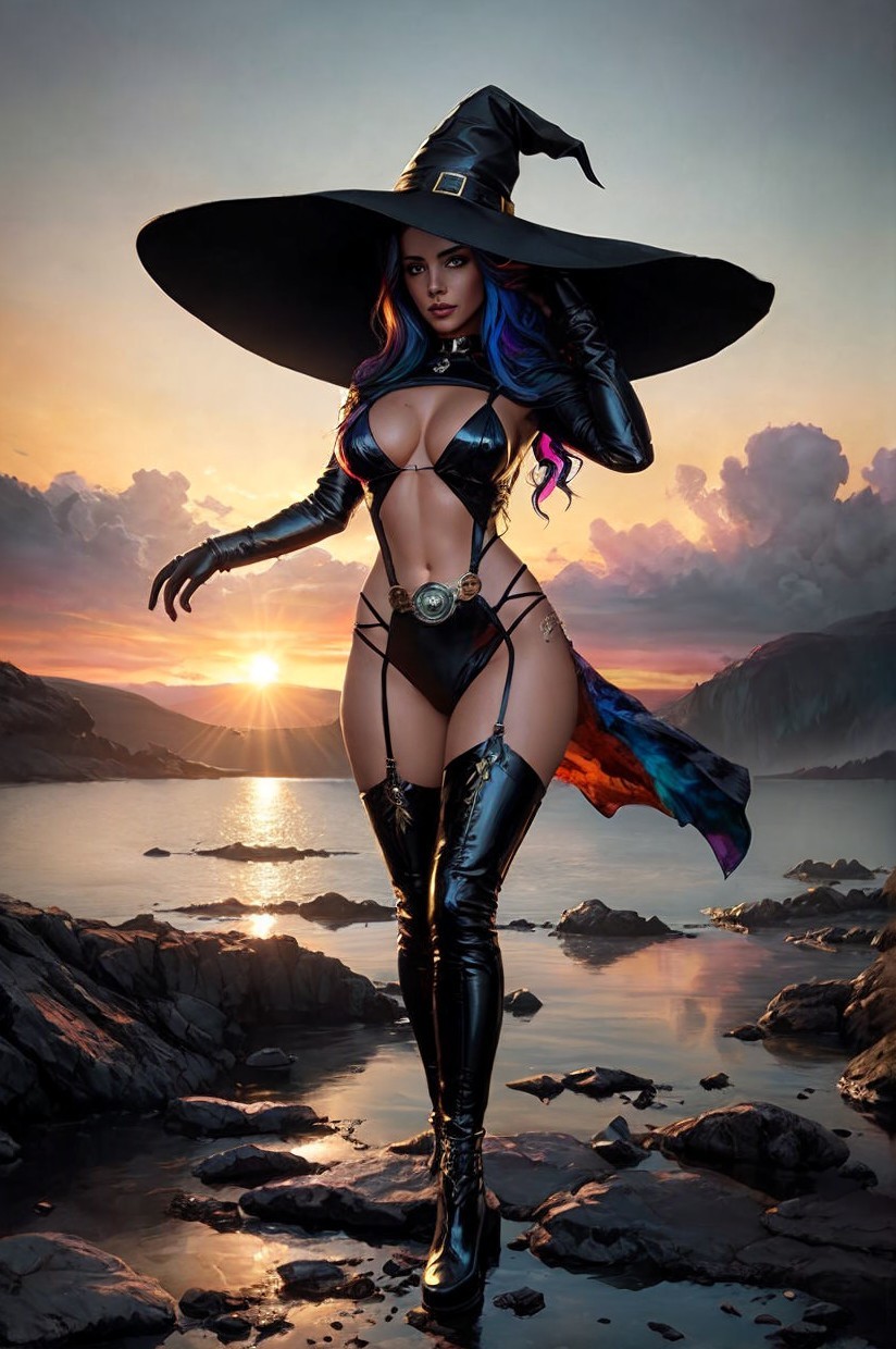 A stylized illustration of a witch with colorful hair, wearing a large hat and black outfit, standing by a rocky shore at sunset. Somewhat oversized hat? No. It's just that the witch is very very tiny. Only about 1.75 m tall....