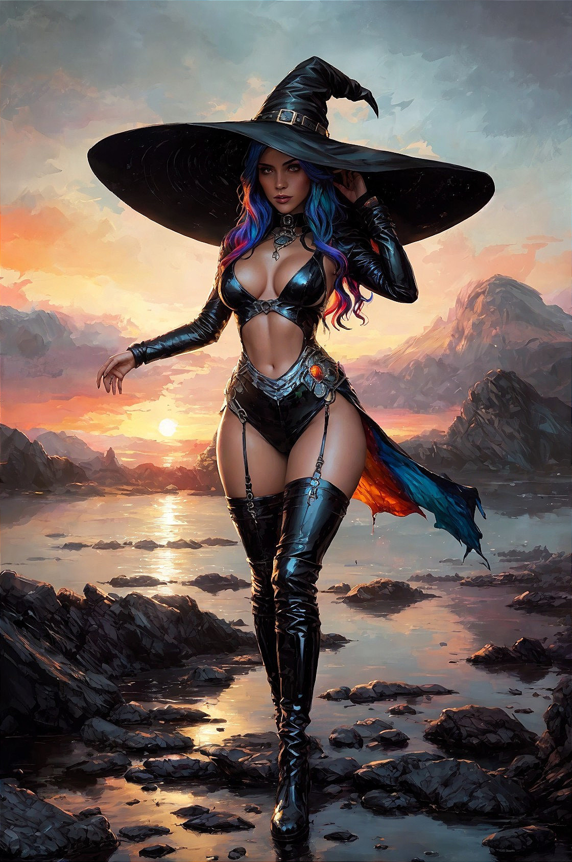 + Prompt:wonderous lake and rocky roads , full body portrait, beautiful witch posing in SUNSET landscap, giant hat,, comics style mixed with dystopian DETAILS, mixed media by bill sienkiewicz, colorful palette hyperrealistic, splash art, concept art, mid shot, intricately detailed, color depth, dramatic, side light, oil gouache melting, acrylic, high contrast, colorful polychromatic, ultra detailed, ultra quality, cgsociety