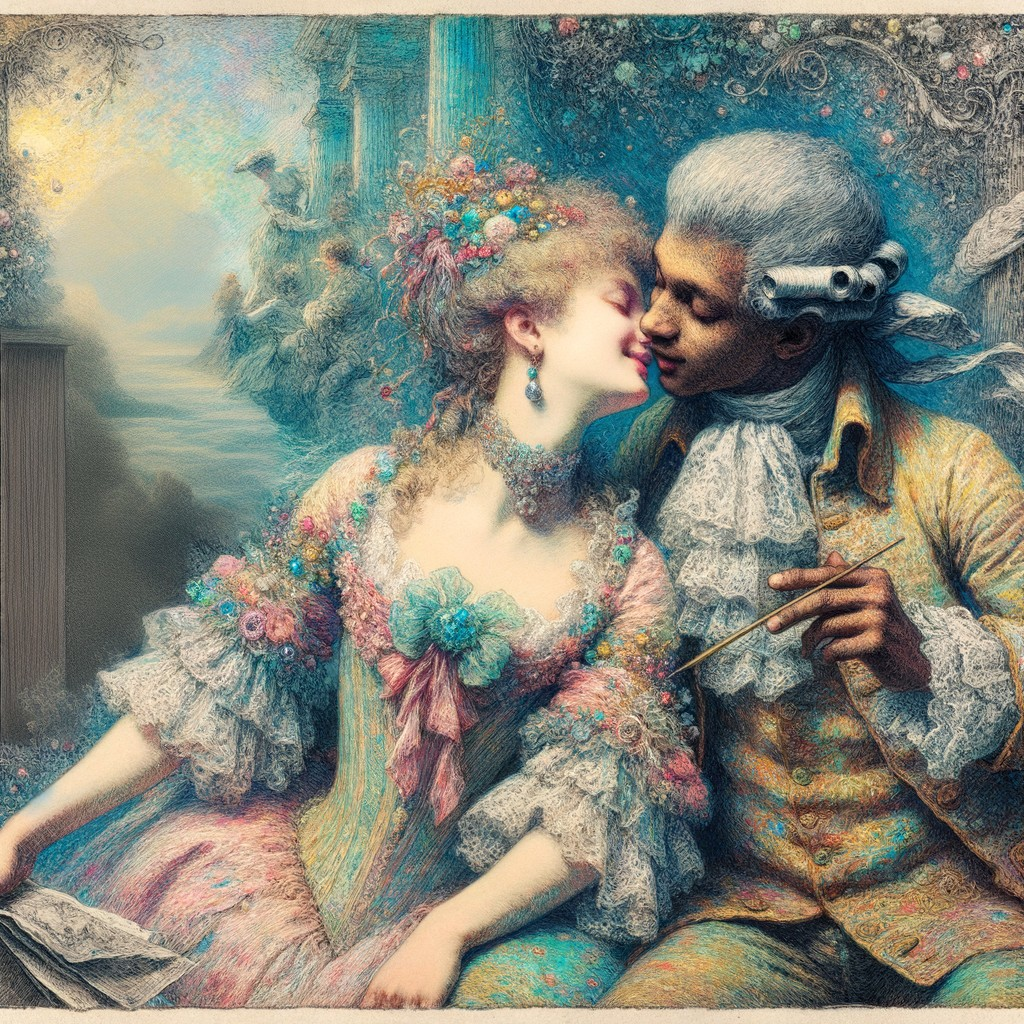 A vintage illustration of a man in a wig kissing a woman's cheek, both in elaborate 18th-century attire, against a romantic backdrop.
