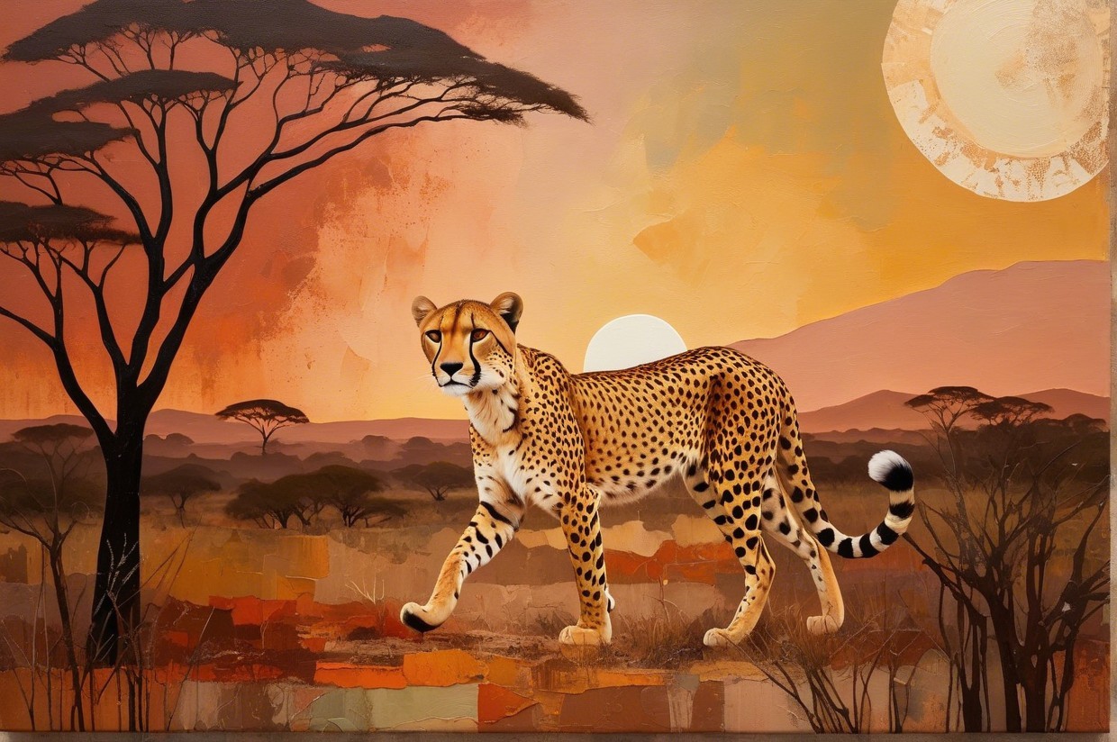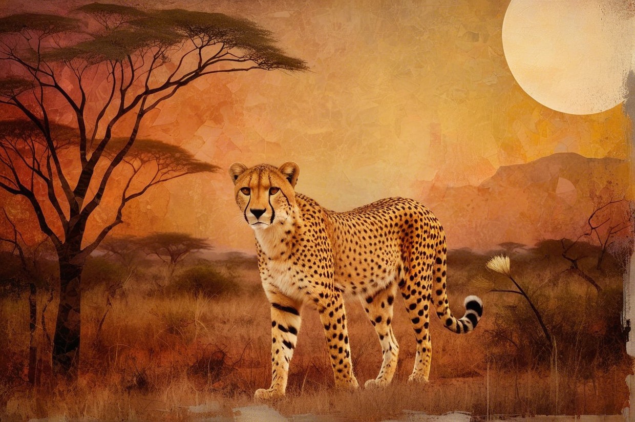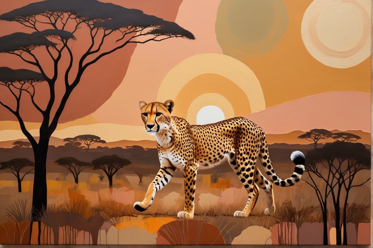 A cheetah stands majestically against a warm, abstract landscape with stylized trees and large sun-like shapes, his stance is that of a hunter; all his primal instincts have been aroused.