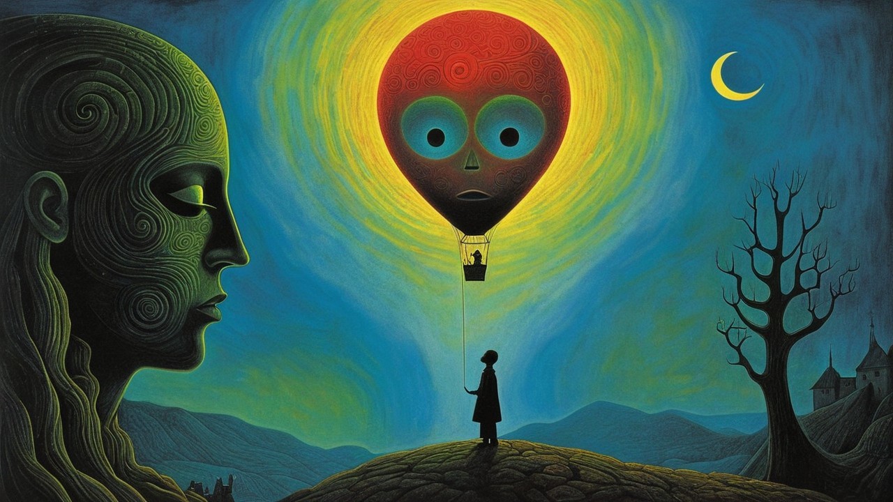 A highly detailed painting depicts an ethereal, surreal, and mystical landscape. On the left, a giant, otherworldly figure with intricate green spiral patterns on her skin and hair, with closed eyes and a serene expression, observes the scene. In the center, a red hot air balloon resembling a face with glowing