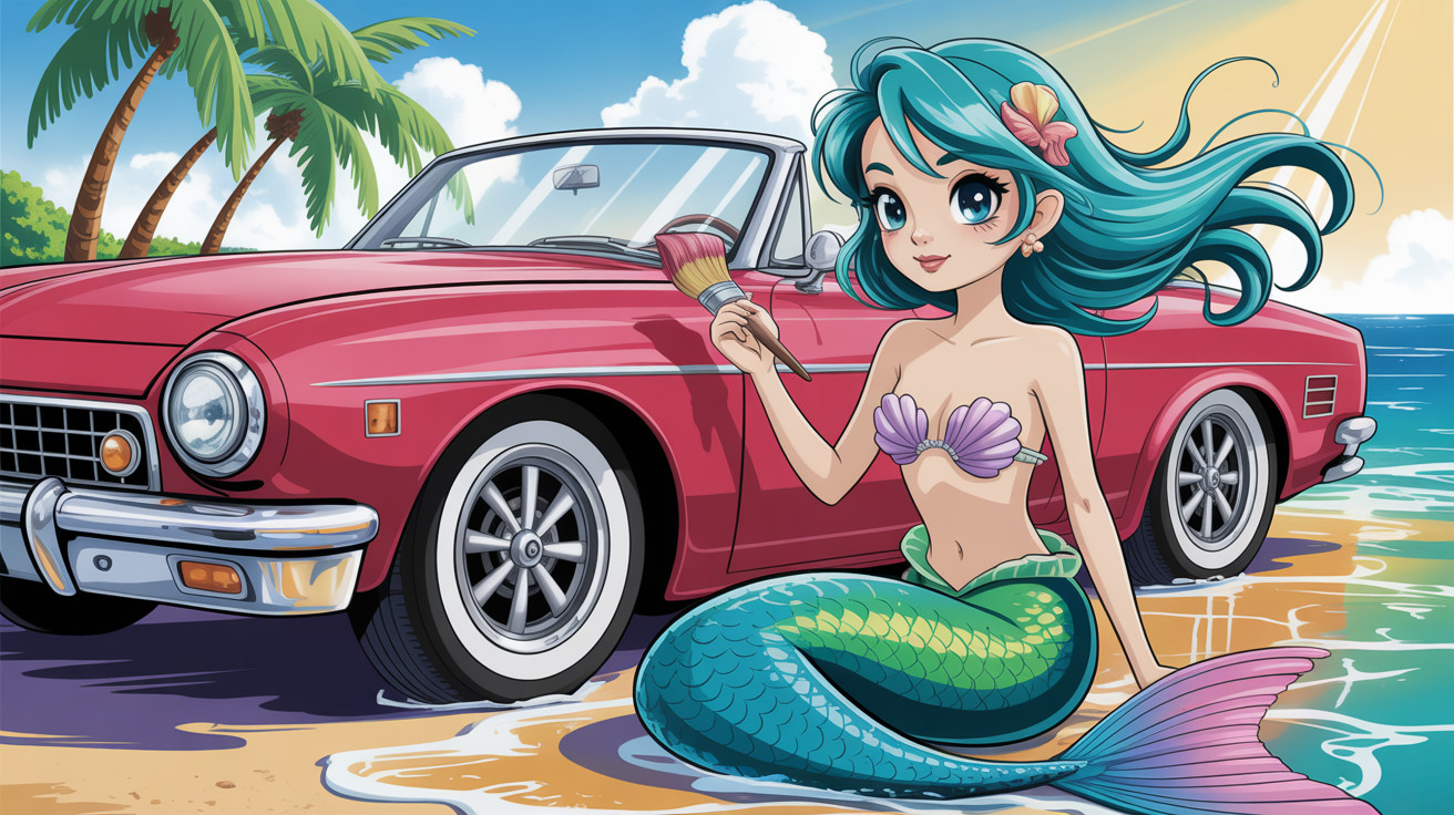 A whimsical scene unfolds as a charming anime mermaid, with vibrant scales and flowing hair, joyfully paints a colorful car by the shore, blending fantasy and creativity in a delightful way.