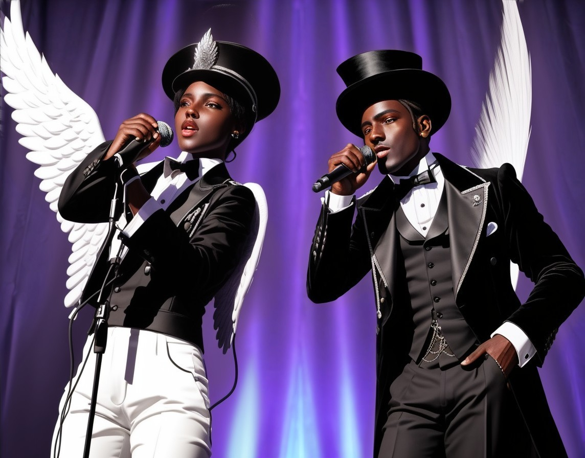 The Archangel Gabriel and Baron Samedi sing a duet against the purple backdrop of the celestial realms.