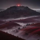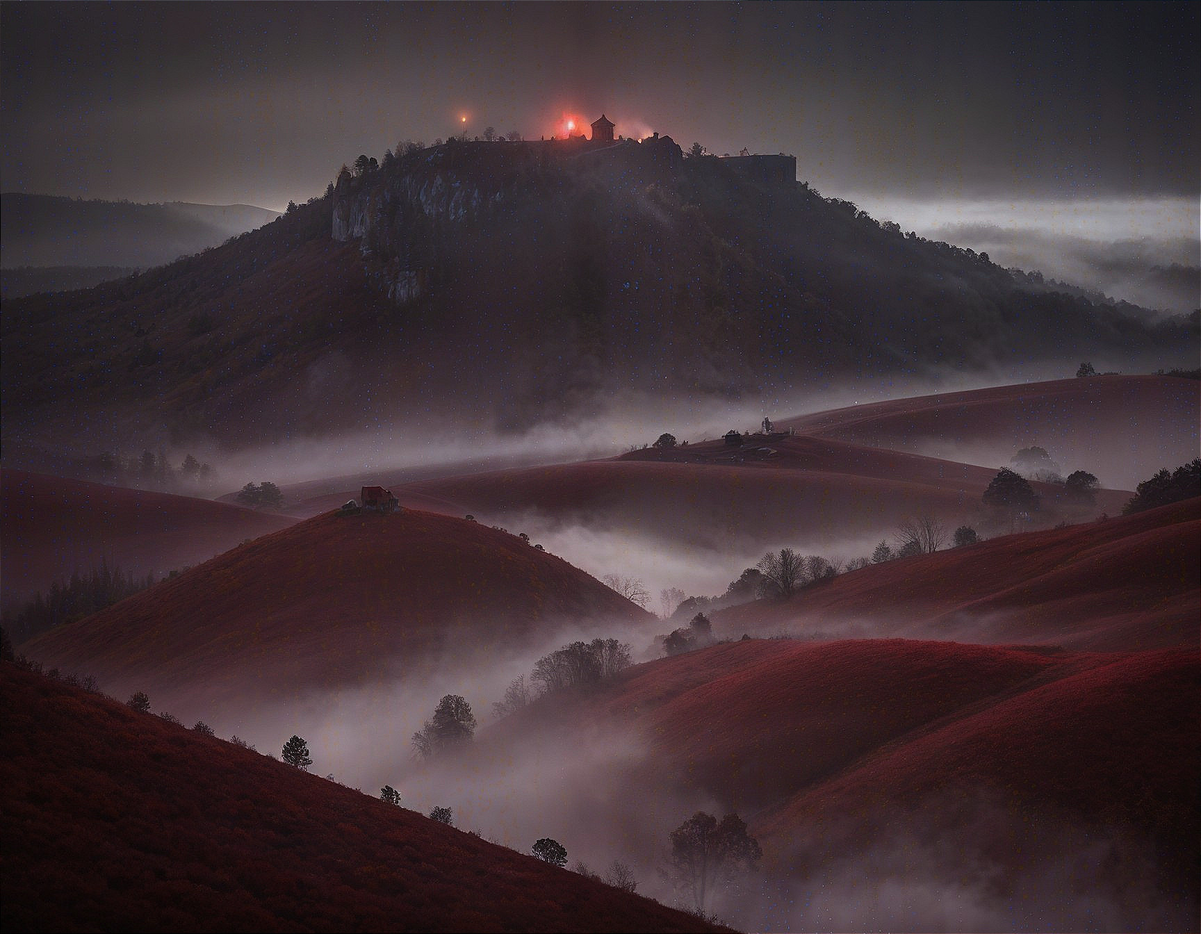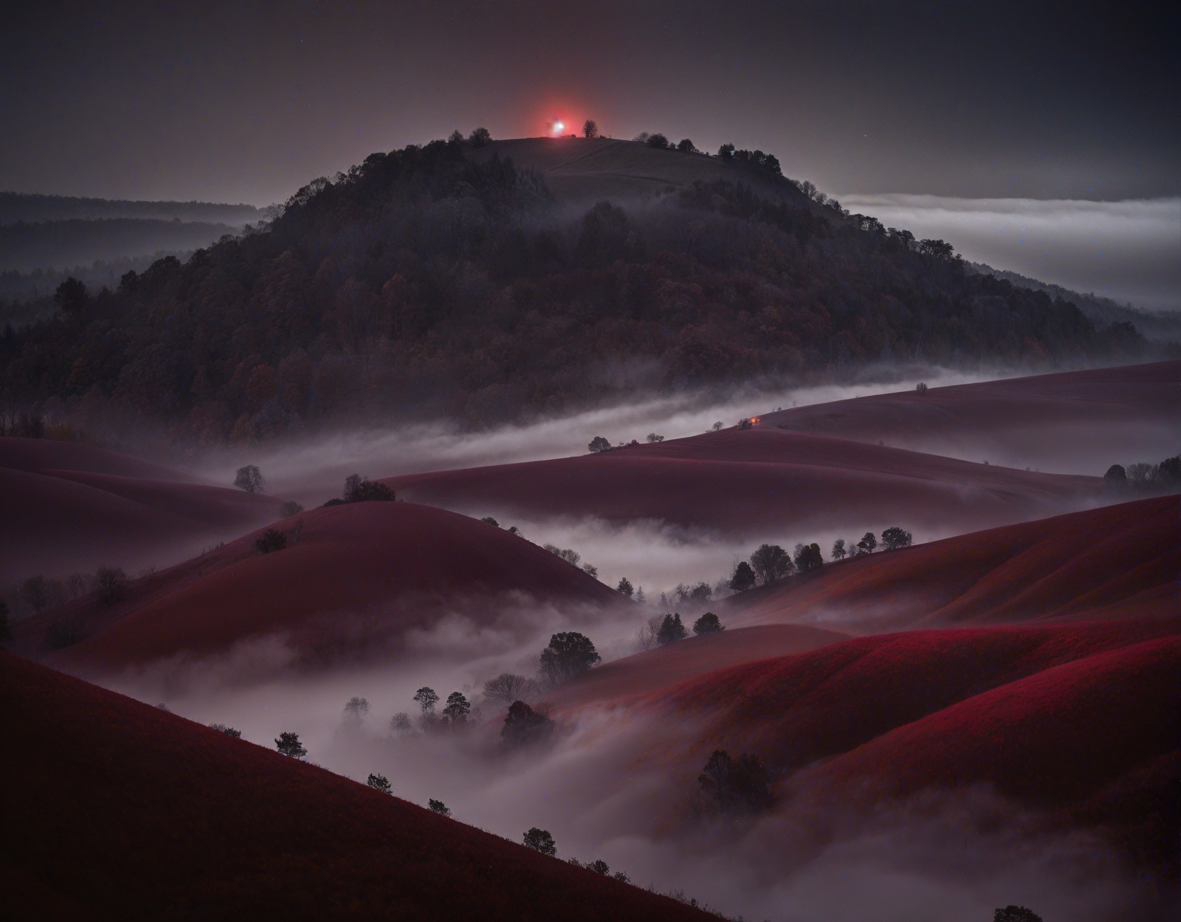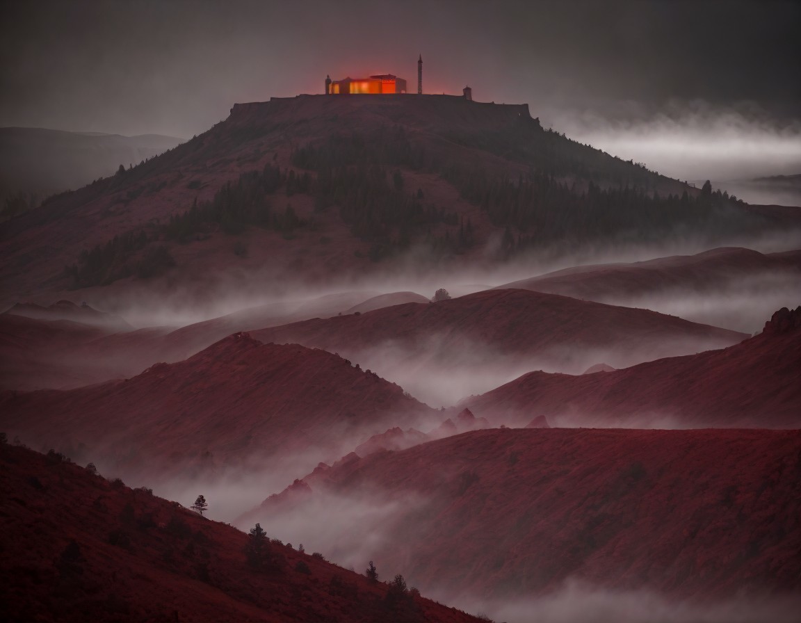 A serene landscape features rolling hills bathed in a pinkish-red glow from the setting sun, silhouetting a lone figure atop a distant hill amid sparse trees.