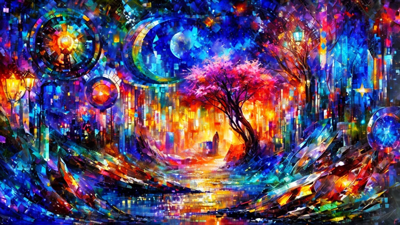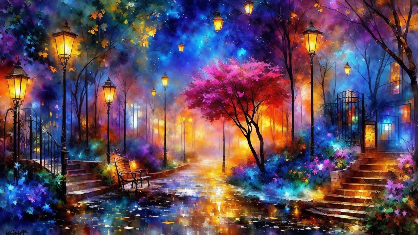 Vibrant impressionistic painting of person on wet, glowing street