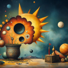 A surreal landscape features a large sun and a wilted plant with planets and spheres emerging from it. Elements of nature and imagination intertwine, creating a dreamlike atmosphere.