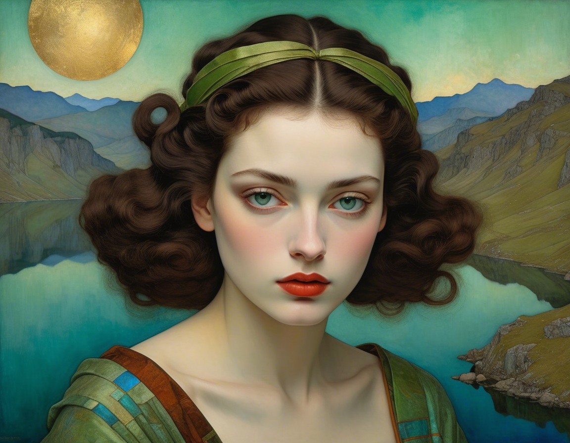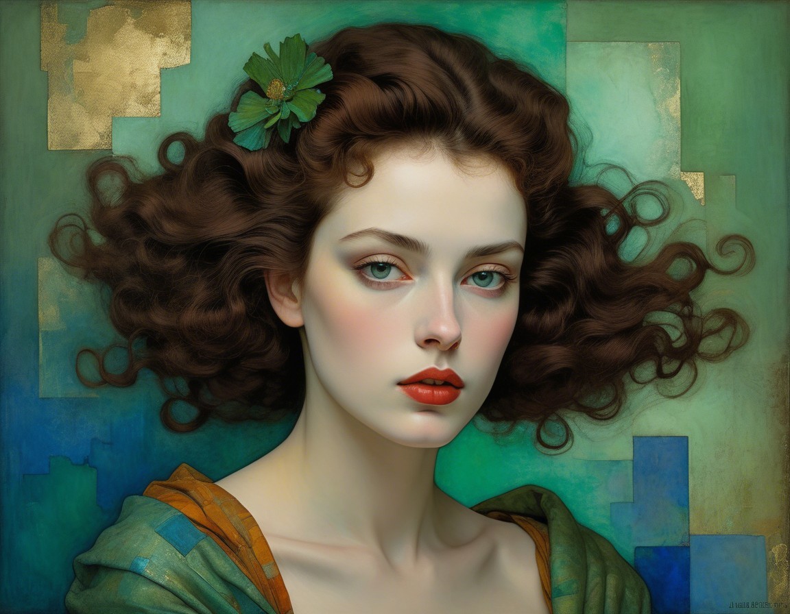 A striking portrait features a young woman with voluminous, curly hair and captivating green eyes, set against a vibrant, colorful background that enhances her ethereal beauty.